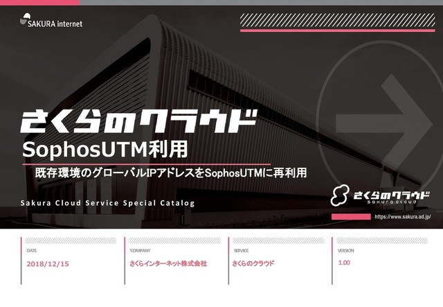k u ra C l o u d S e r v i c e S p e c i a l C a t a l o g 2018/12/15 さくらインターネット株式会社 1.00 さくらのクラウド SophosUTM利用 既存環境のグローバルIPアドレスをSophosUTMに再利用