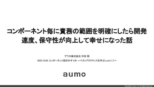 Design ディレクトリ 責務 1 Atoms(原子) ~components/atoms ・最小UIコンポーネント 2 Molecules(分子) ~components/molecules ・Atomsを組合せたUIコンポーネント 3 Organisms(有機体) ~components/organisms ・複数のAtoms、Moleculesを持つUIコンポーネント ・ビジネスロジック ・状態管理(Dispatch/Render) 4 Template(テンプレート) ~layouts ・下位レベルのコンポーネントを組み合わせた UIフレーム 5 Page(ページ) ~pages ・アプリケーションのルート ・router関連の処理 ・認証認可 ・状態管理(Dispatch) Atomic Designに合わせて責務を区切る