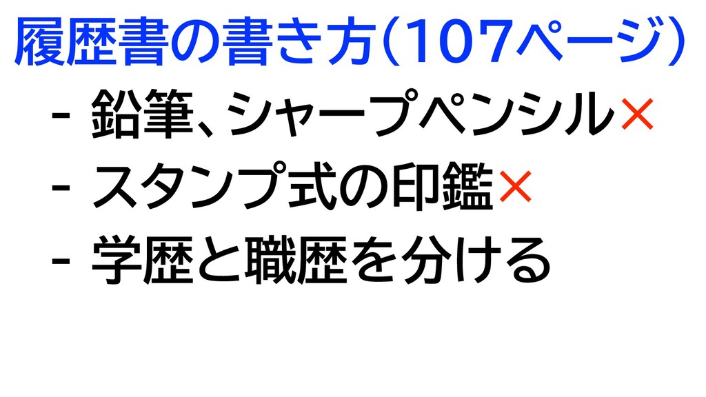 履歴書の書き方(107ページ) - 鉛筆、シャープペンシル× - スタンプ式の印鑑× - 学歴と職歴を分ける