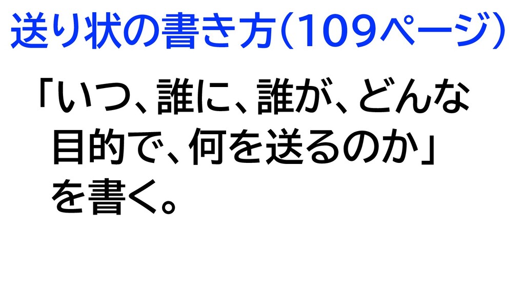 送り状の書き方(109ページ) 「いつ、誰に、誰が、どんな 目的で、何を送るのか」 を書く。