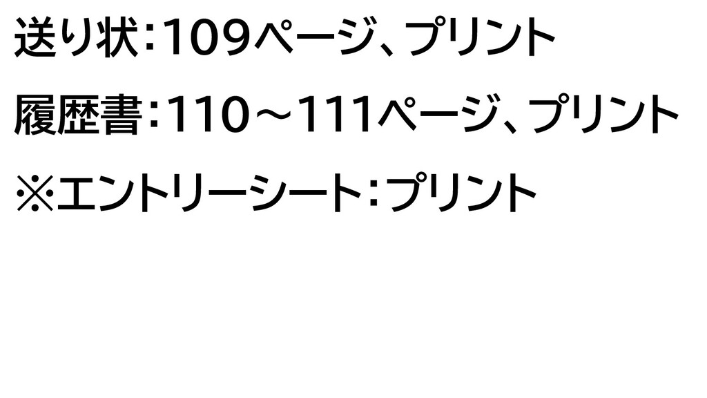 送り状:109ページ、プリント 履歴書:110〜111ページ、プリント ※エントリーシート:プリント