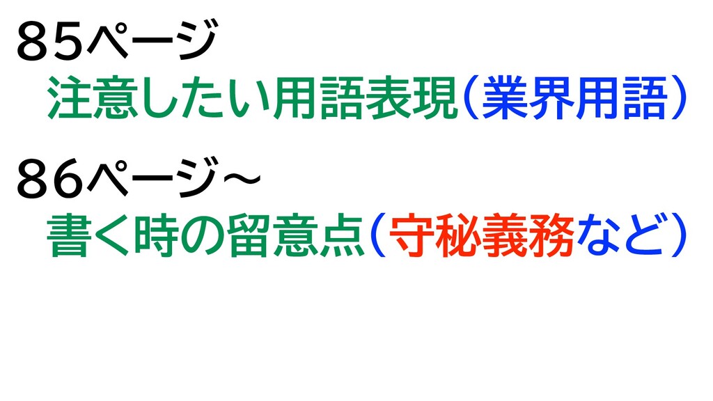 85ページ 注意したい用語表現(業界用語) 86ページ〜 書く時の留意点(守秘義務など)
