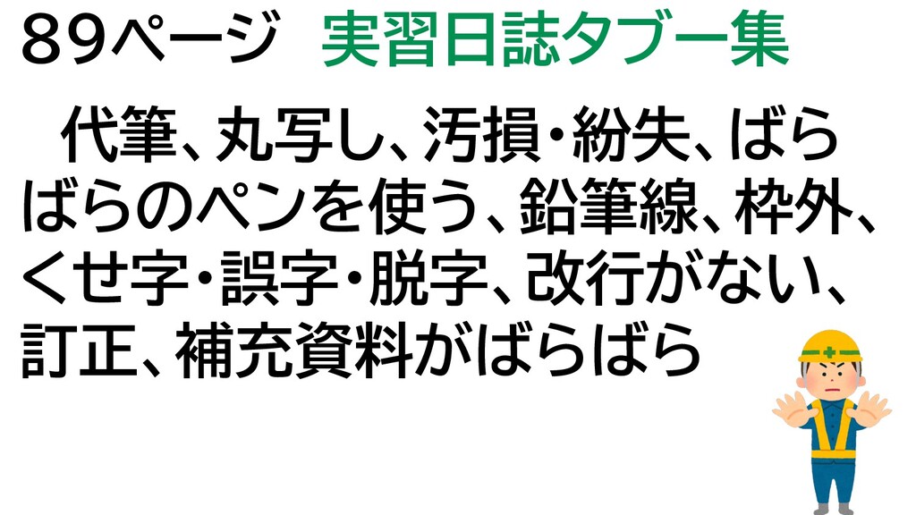 89ページ 実習日誌タブー集 代筆、丸写し、汚損・紛失、ばら ばらのペンを使う、鉛筆線、枠外、 くせ字・誤字・脱字、改行がない、 訂正、補充資料がばらばら