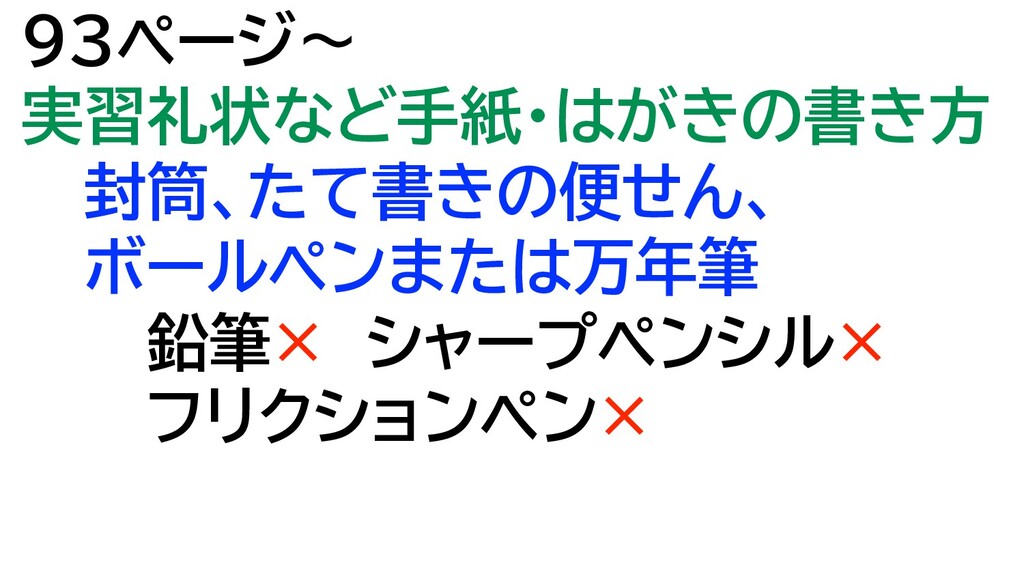 93ページ〜 実習礼状など手紙・はがきの書き方 封筒、たて書きの便せん、 ボールペンまたは万年筆 鉛筆× シャープペンシル× フリクションペン×
