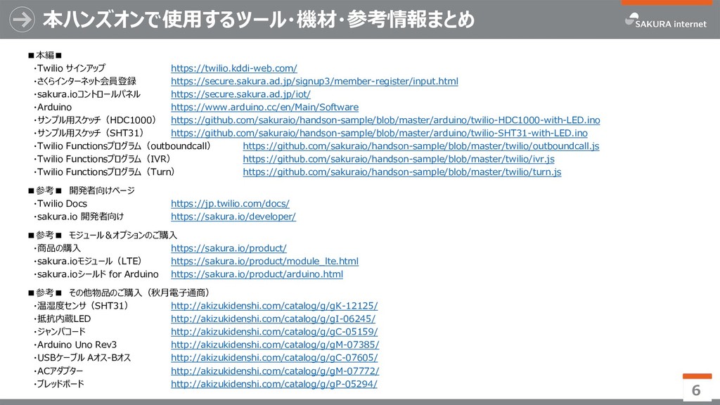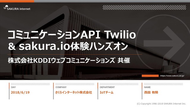 本資料ではコミュニケーションAPIサービスのTwilio(トゥイリオ)と連携し、「Arduino+sakura.ioモジュールを用いたマイコンおよびプログラムの構築」から「Twilioを用いたWebサービス連携」までの手順をスライドでご覧いただけます。