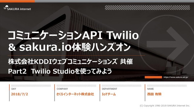 本資料ではコミュニケーションAPIサービスのTwilio(トゥイリオ)と連携し、「Arduino+sakura.ioモジュールを用いたマイコンおよびプログラムの構築」から「Twilioを用いたWebサービス連携」までの手順をスライドでご覧いただけます。
