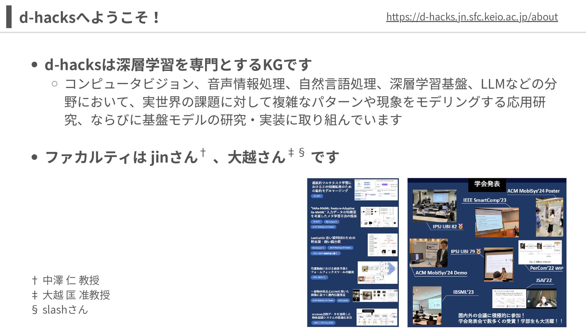 d-hacksへようこそ! d-hacksは深層学習を専門とするKGです コンピュータビジョン、音声情報処理、自然言語処理、深層学習基盤、LLMなどの分 野において、実世界の課題に対して複雑なパターンや現象をモデリングする応用研 究、ならびに基盤モデルの研究・実装に取り組んでいます ファカルティは jinさん 、大越さん です † 中澤