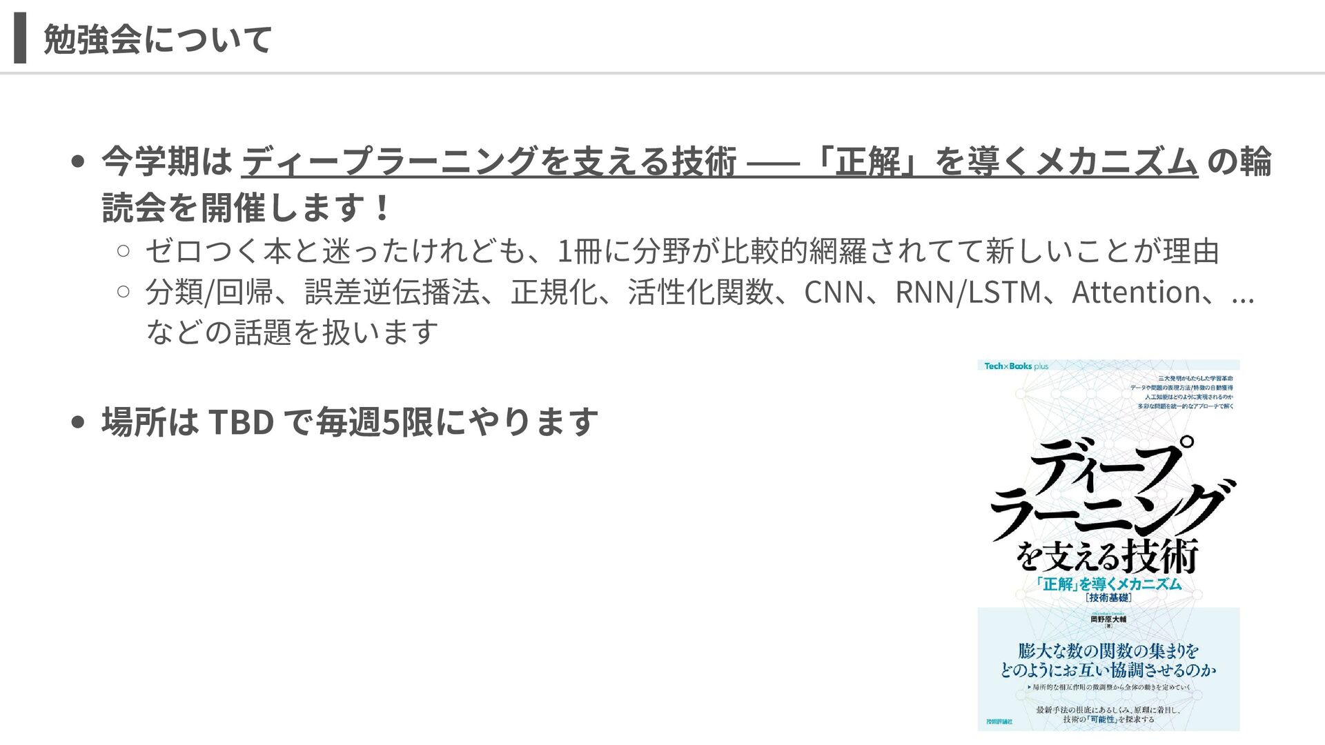 勉強会について 今学期は ディープラーニングを支える技術 ——「正解」を導くメカニズム の輪 読会を開催します! ゼロつく本と迷ったけれども、1冊に分野が比較的網羅されてて新しいことが理由 分類/回帰、誤差逆伝播法、正規化、活性化関数、CNN、RNN/LSTM、Attention、... などの話題を扱います 場所は
