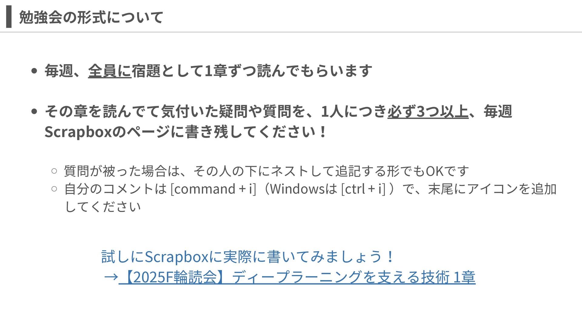 i] )で、末尾にアイコンを追加 してください 勉強会の形式について 試しにScrapboxに実際に書いてみましょう! →【2025F輪読会】ディープラーニングを支える技術 1章