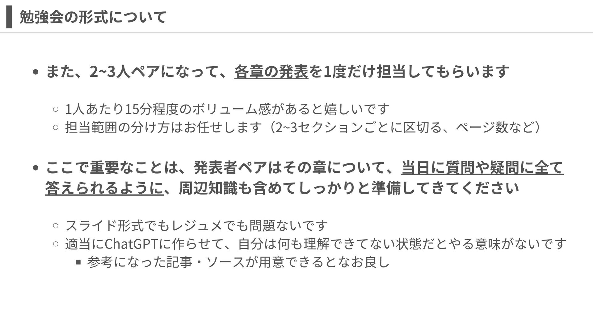 勉強会の形式について また、2~3人ペアになって、各章の発表を1度だけ担当してもらいます 1人あたり15分程度のボリューム感があると嬉しいです 担当範囲の分け方はお任せします(2~3セクションごとに区切る、ページ数など) ここで重要なことは、発表者ペアはその章について、当日に質問や疑問に全て 答えられるように、周辺知識も含めてしっかりと準備してきてください スライド形式でもレジュメでも問題ないです 適当にChatGPTに作らせて、自分は何も理解できてない状態だとやる意味がないです 参考になった記事・ソースが用意できるとなお良し