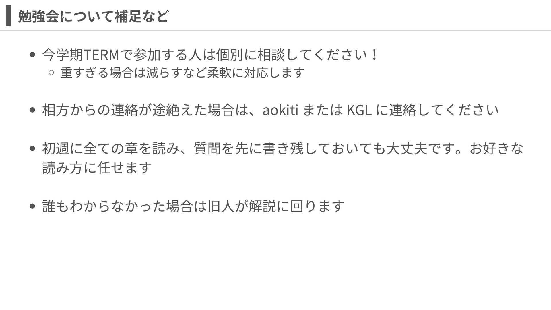 勉強会について補足など 今学期TERMで参加する人は個別に相談してください! 重すぎる場合は減らすなど柔軟に対応します 相方からの連絡が途絶えた場合は、aokiti または KGL に連絡してください 初週に全ての章を読み、質問を先に書き残しておいても大丈夫です。お好きな 読み方に任せます 誰もわからなかった場合は旧人が解説に回ります