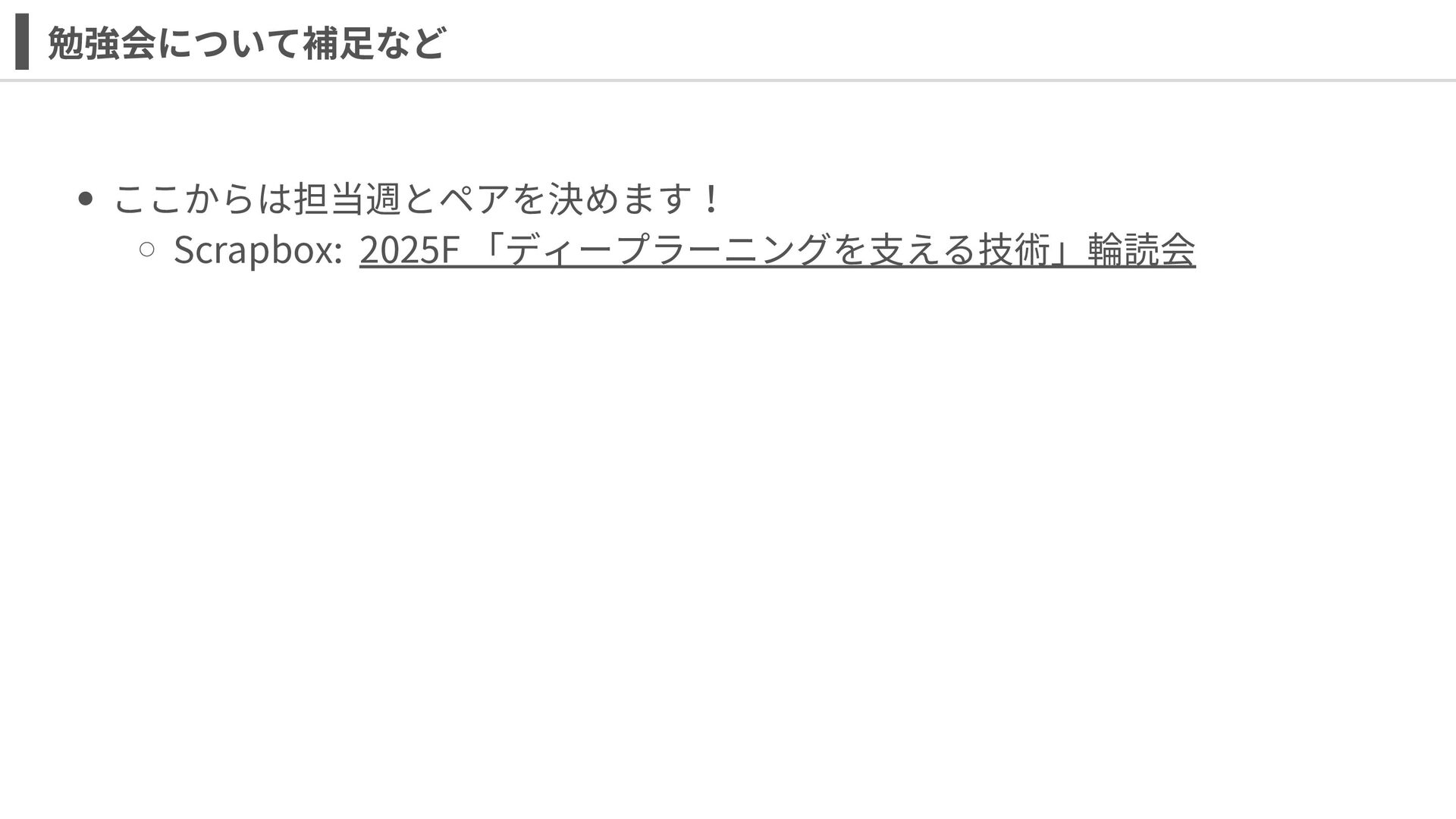 勉強会について補足など ここからは担当週とペアを決めます! Scrapbox: 2025F 「ディープラーニングを支える技術」輪読会