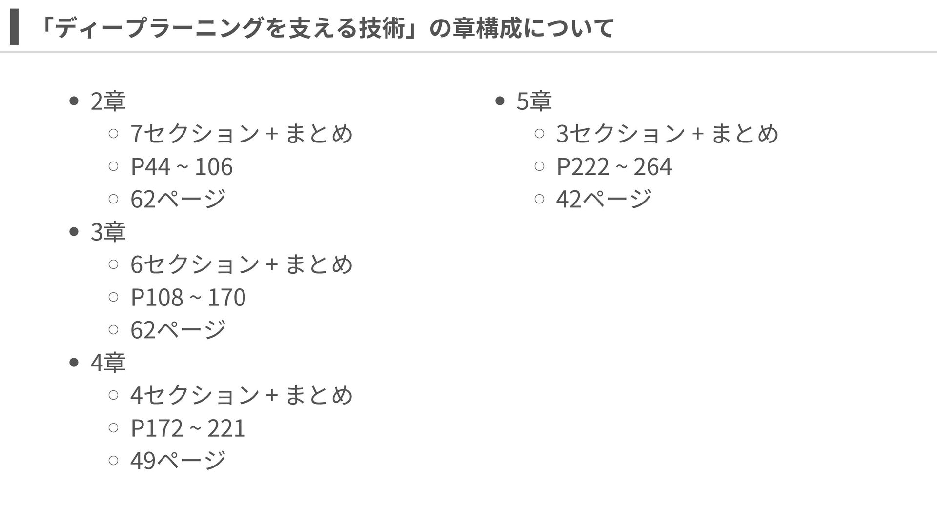 「ディープラーニングを支える技術」の章構成について 2章 7セクション + まとめ P44 ~ 106 62ページ 3章