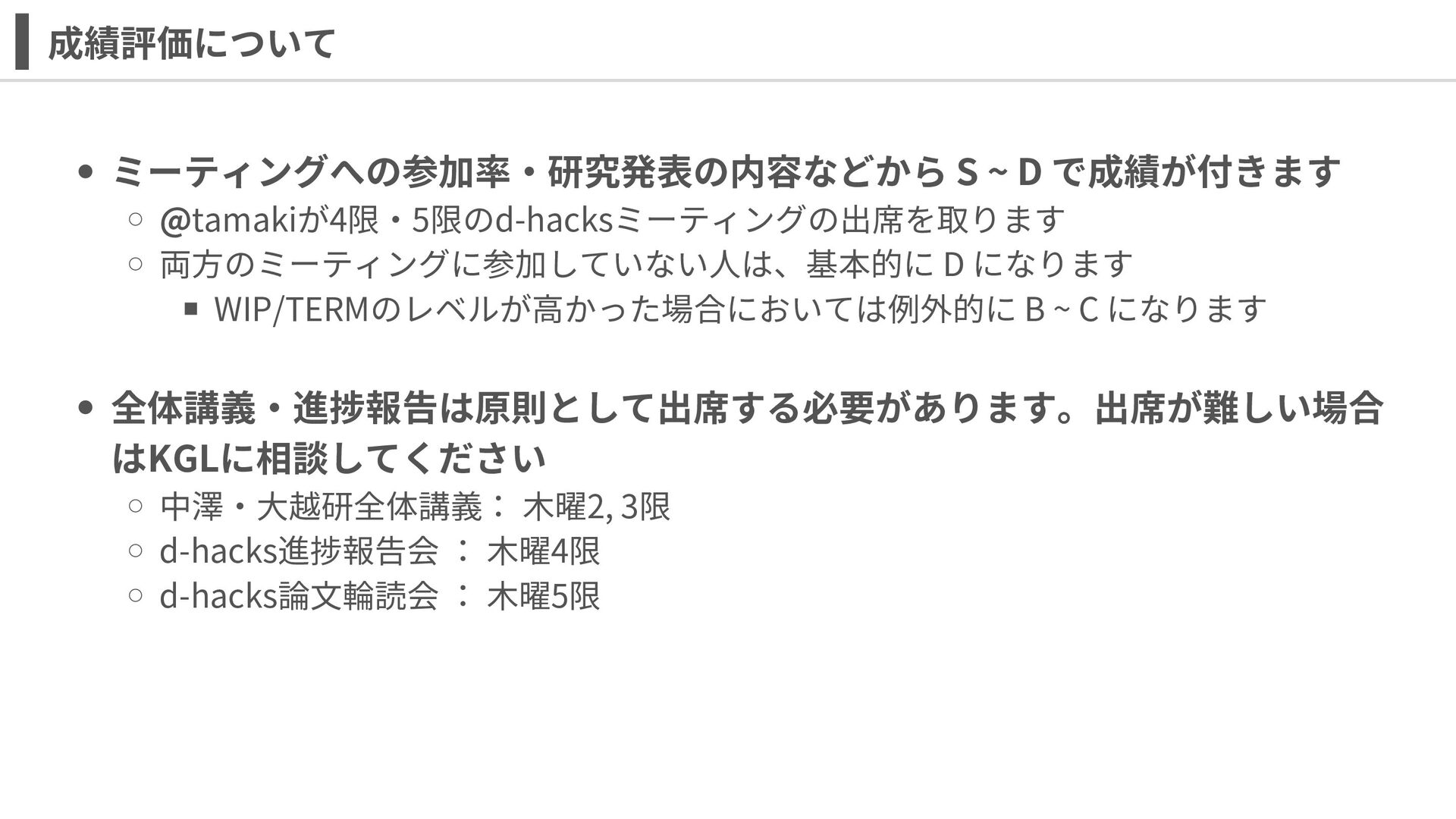 WIP/TERMのレベルが高かった場合においては例外的に B ~ C になります 全体講義・進捗報告は原則として出席する必要があります。出席が難しい場合 はKGLに相談してください 中澤・大越研全体講義: 木曜2, 3限 d-hacks進捗報告会 : 木曜4限 d-hacks論文輪読会 : 木曜5限