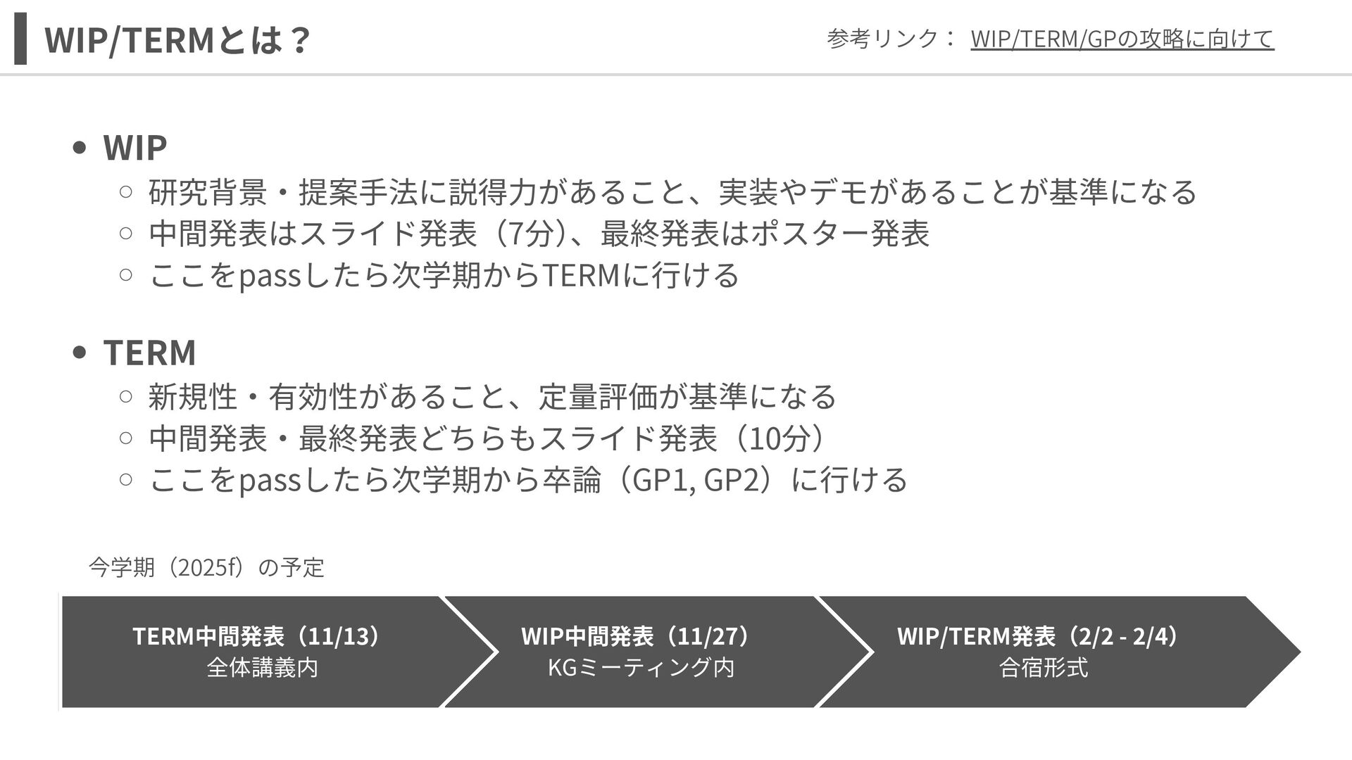 WIP中間発表(11/27) KGミーティング内 TERM中間発表(11/13) 全体講義内 TERM 新規性・有効性があること、定量評価が基準になる 中間発表・最終発表どちらもスライド発表(10分) ここをpassしたら次学期から卒論(GP1, GP2)に行ける 今学期(2025f)の予定 WIP/TERM/GPの攻略に向けて 参考リンク: