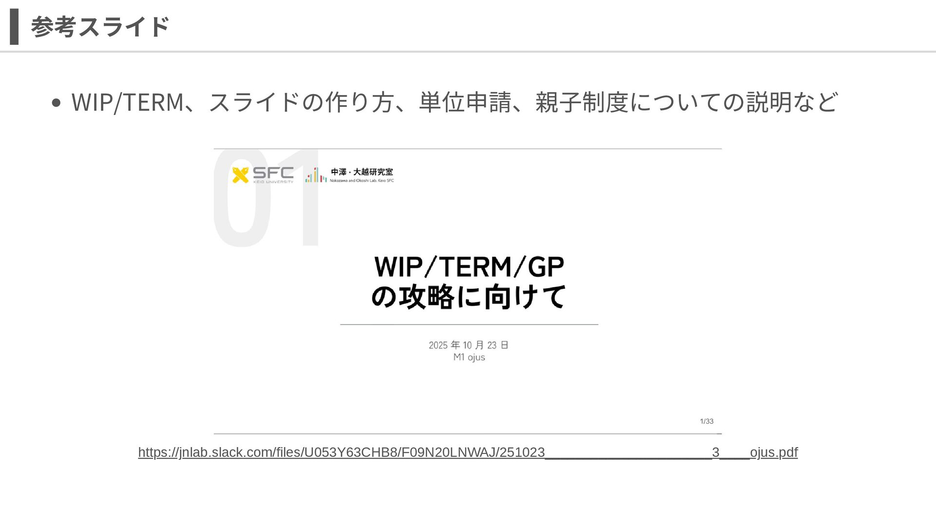 参考スライド https://jnlab.slack.com/files/U053Y63CHB8/F09N20LNWAJ/251023______________________3____ojus.pdf WIP/TERM、スライドの作り方、単位申請、親子制度についての説明など