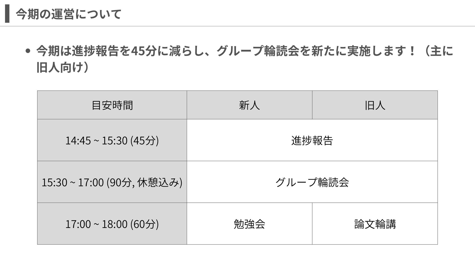 17:00 (90分, 休憩込み) グループ輪読会 17:00 ~ 18:00 (60分) 勉強会 論文輪講 今期の運営について 今期は進捗報告を45分に減らし、グループ輪読会を新たに実施します!(主に 旧人向け)