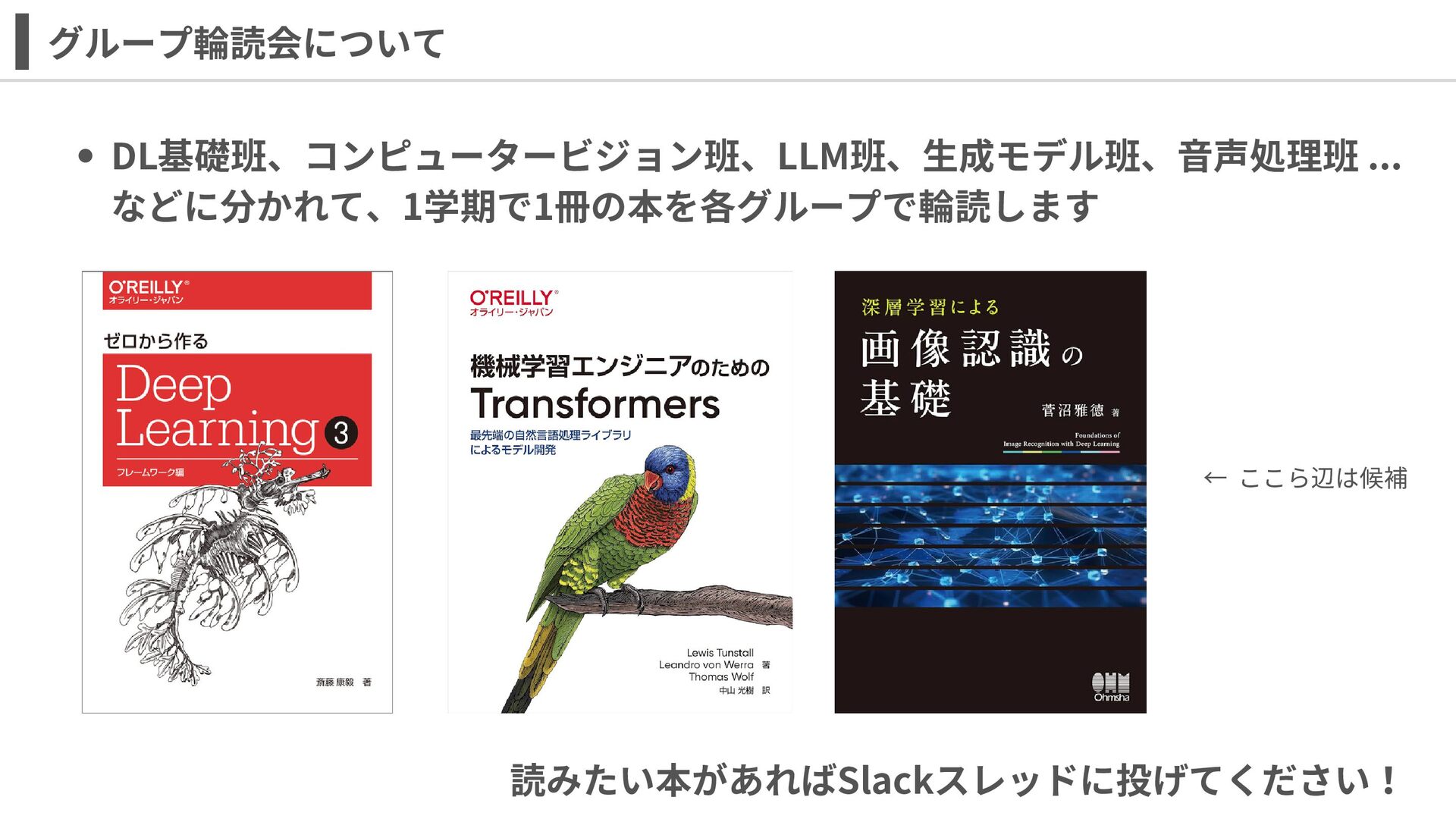 グループ輪読会について DL基礎班、コンピュータービジョン班、LLM班、生成モデル班、音声処理班 ... などに分かれて、1学期で1冊の本を各グループで輪読します 読みたい本があればSlackスレッドに投げてください! ← ここら辺は候補