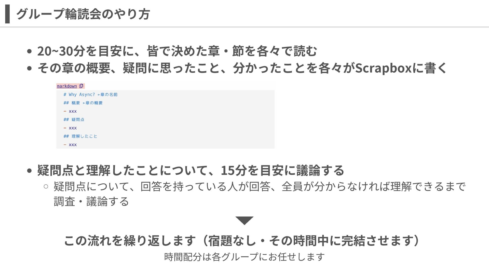 20~30分を目安に、皆で決めた章・節を各々で読む その章の概要、疑問に思ったこと、分かったことを各々がScrapboxに書く 疑問点と理解したことについて、15分を目安に議論する 疑問点について、回答を持っている人が回答、全員が分からなければ理解できるまで 調査・議論する グループ輪読会のやり方 この流れを繰り返します(宿題なし・その時間中に完結させます) 時間配分は各グループにお任せします