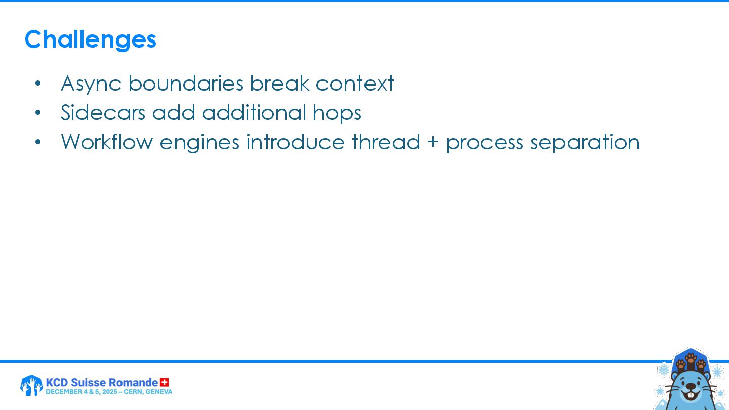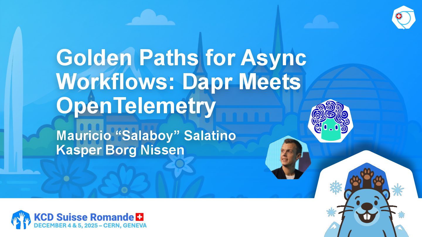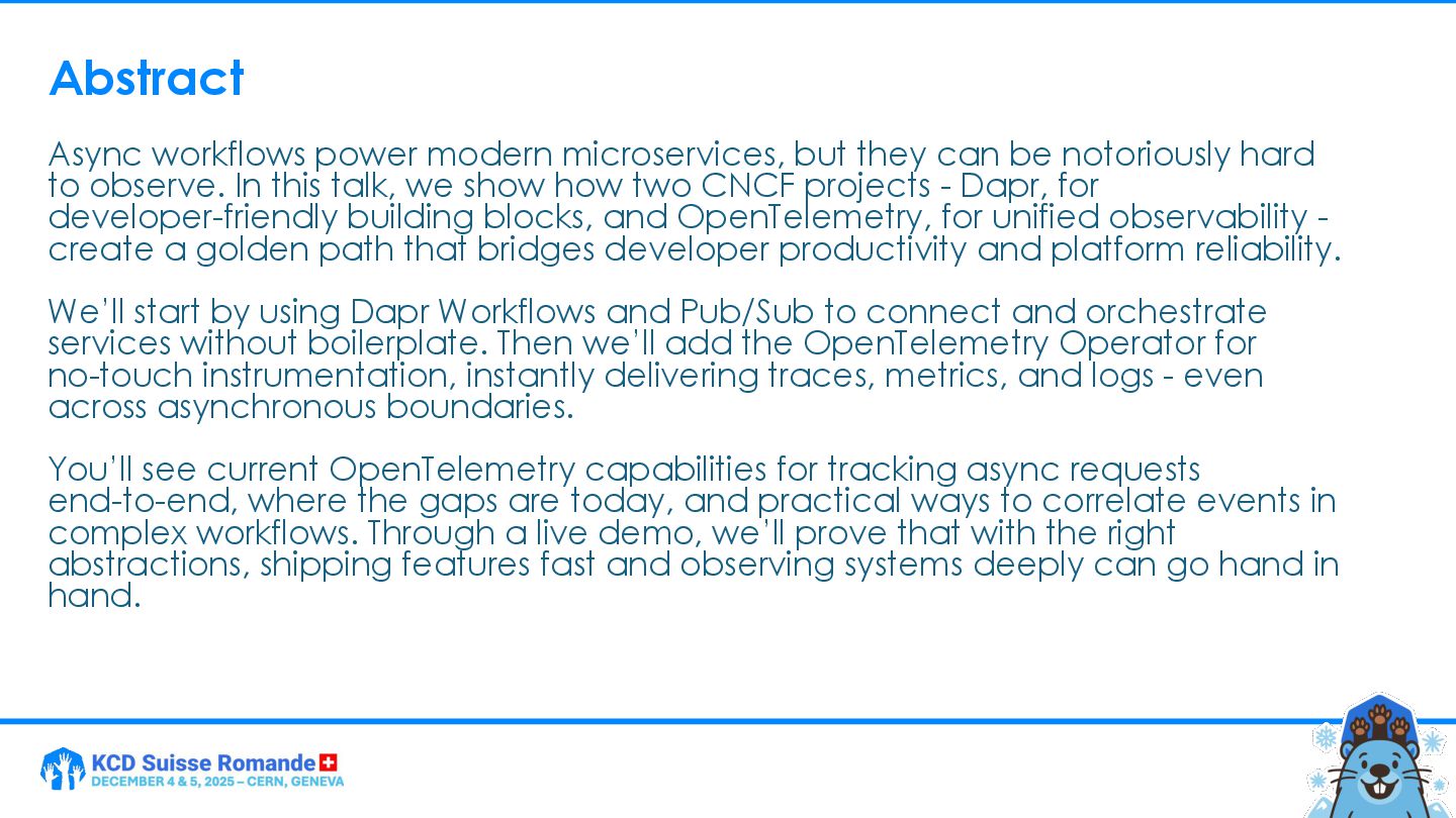 be notoriously hard to observe. In this talk, we show how two CNCF projects - Dapr, for developer-friendly building blocks, and OpenTelemetry, for unified observability - create a golden path that bridges developer productivity and platform reliability. We’ll start by using Dapr Workflows and Pub/Sub to connect and orchestrate services without boilerplate. Then we’ll add the OpenTelemetry Operator for no-touch instrumentation, instantly delivering traces, metrics, and logs - even across asynchronous boundaries. You’ll see current OpenTelemetry capabilities for tracking async requests end-to-end, where the gaps are today, and practical ways to correlate events in complex workflows. Through a live demo, we’ll prove that with the right abstractions, shipping features fast and observing systems deeply can go hand in hand.