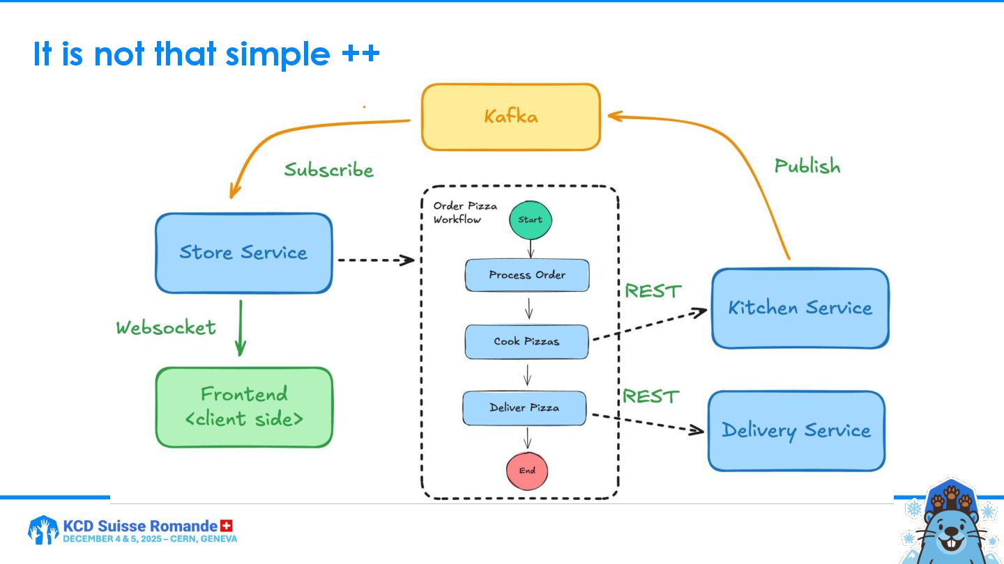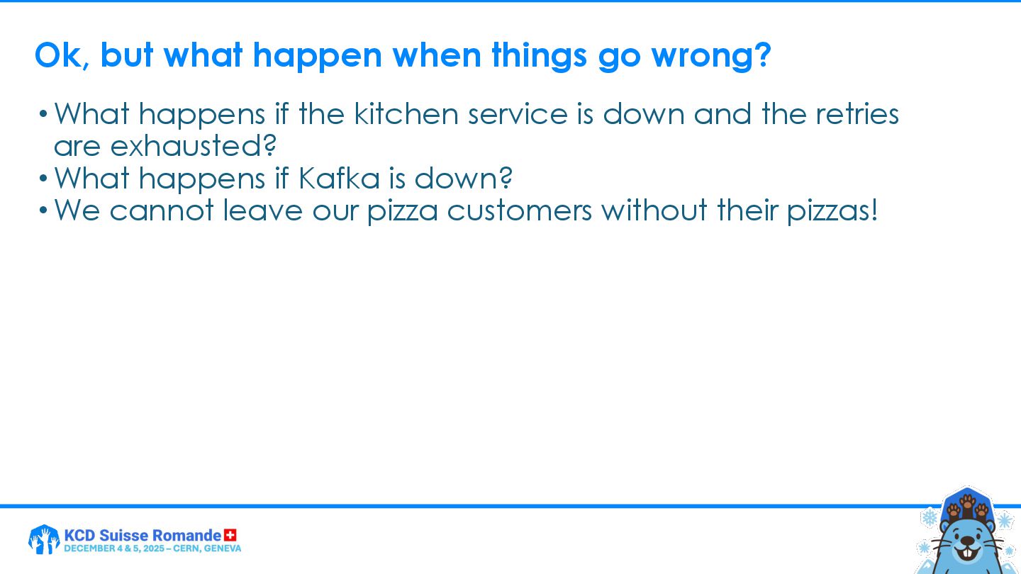 happens if the kitchen service is down and the retries are exhausted? •What happens if Kafka is down? •We cannot leave our pizza customers without their pizzas!