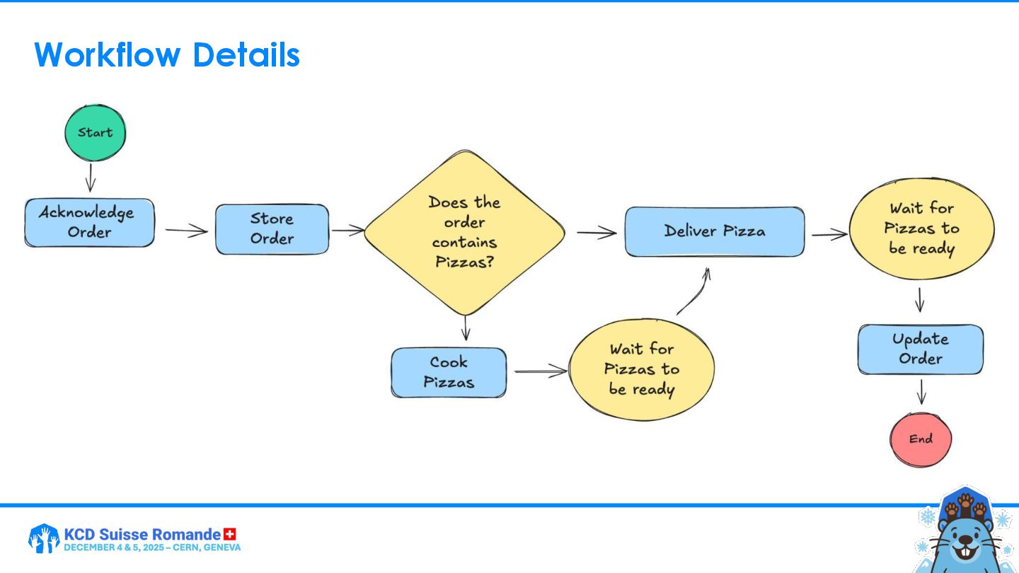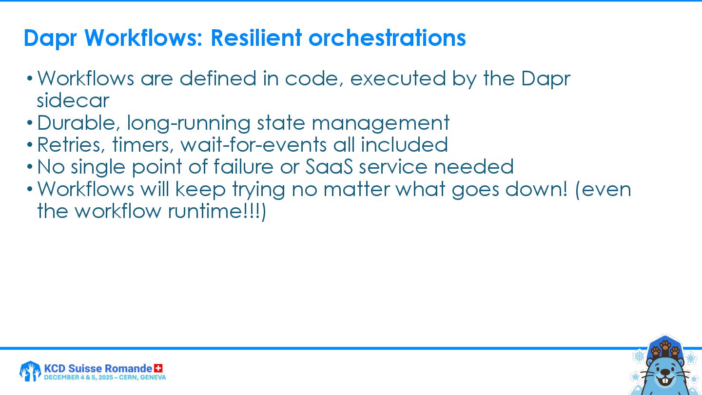 executed by the Dapr sidecar •Durable, long-running state management •Retries, timers, wait-for-events all included •No single point of failure or SaaS service needed •Workflows will keep trying no matter what goes down! (even the workflow runtime!!!)