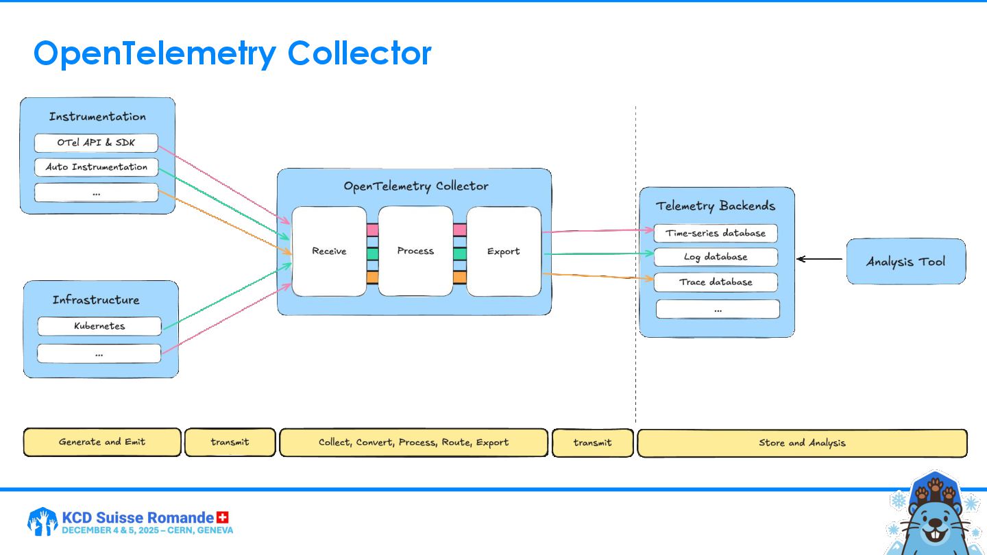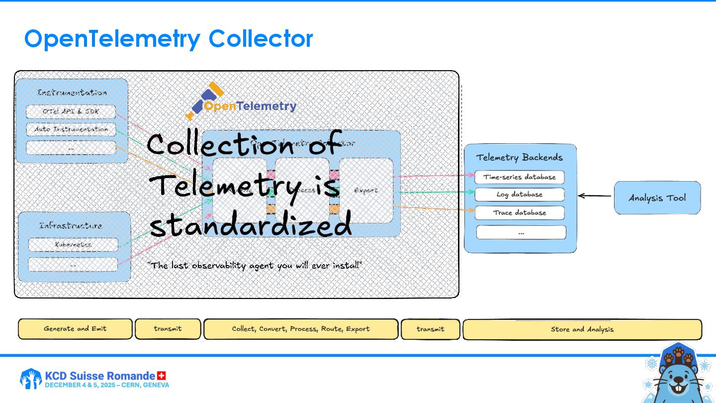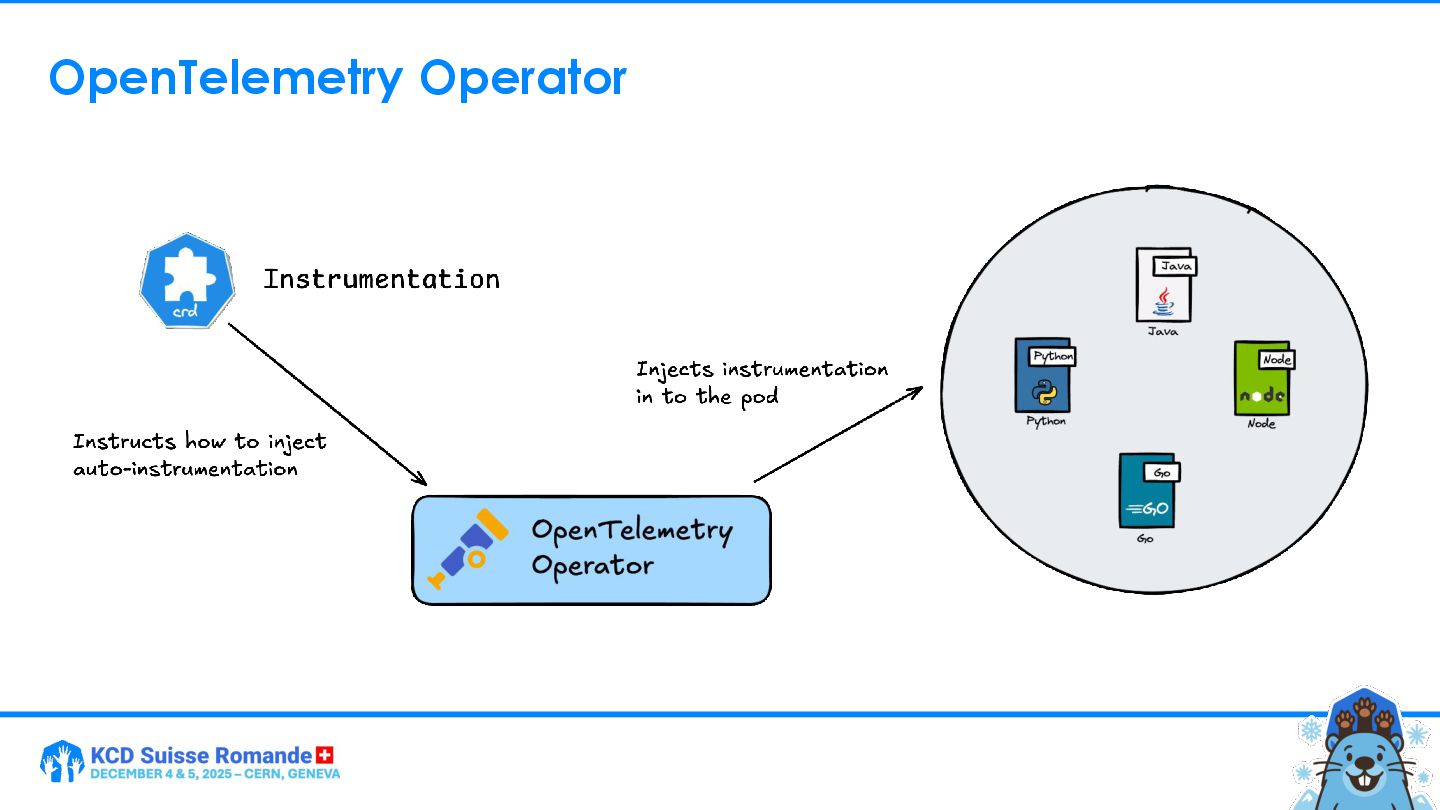 the box • Sidecar emits spans for pub/sub, service invocation, and workflows • OpenTelemetry Operator enables auto-instrumentation • OpenTelemetry Collector handles ingestion, processing, export