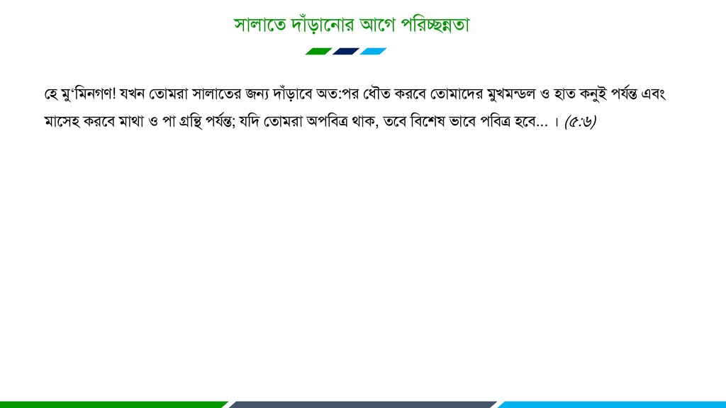 দাাঁড়ারফ অত:য হধৌত কযরফ হতাভারদয ভুখভন্ডর ও াত কনুই মযন্ত এফং ভার কযরফ ভাথা ও া গ্ররি মযন্ত; মরদ হতাভযা অরফত্র থাক, তরফ রফরল বারফ রফত্র রফ... । (৫:৬)