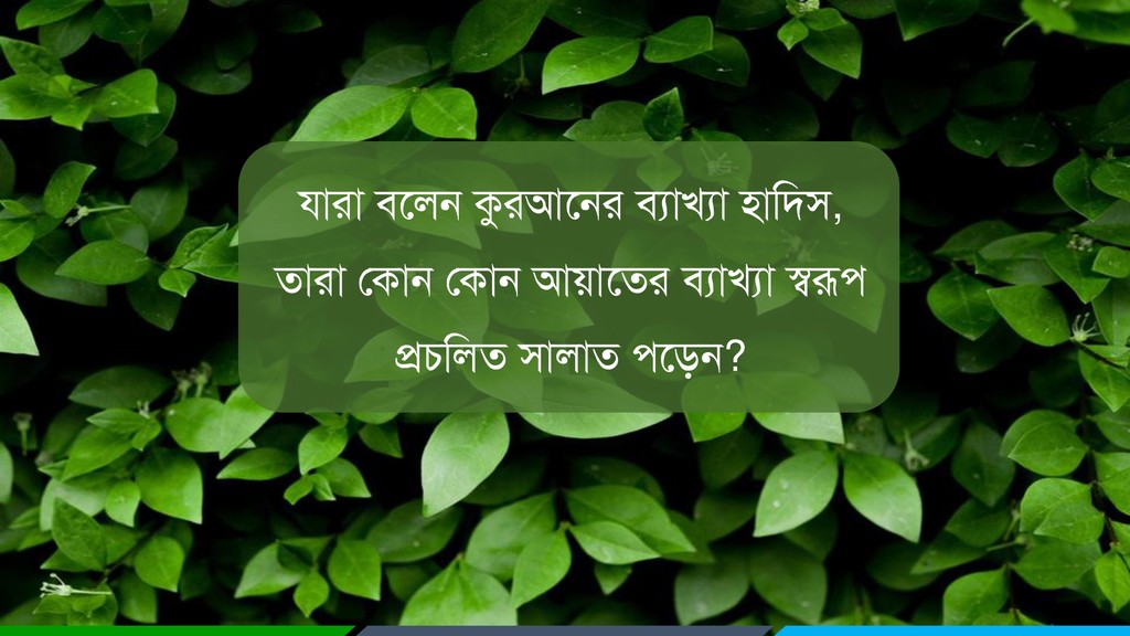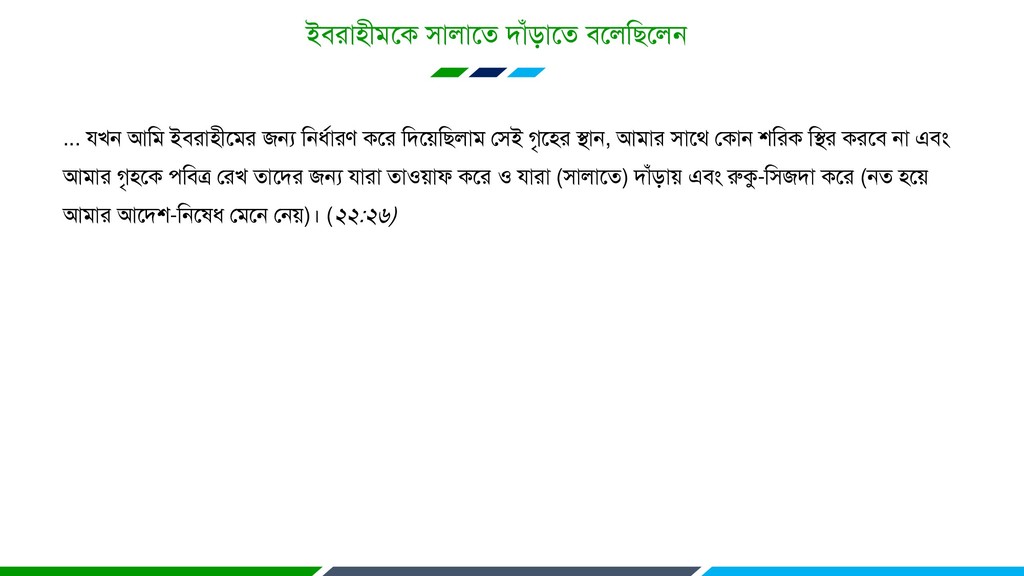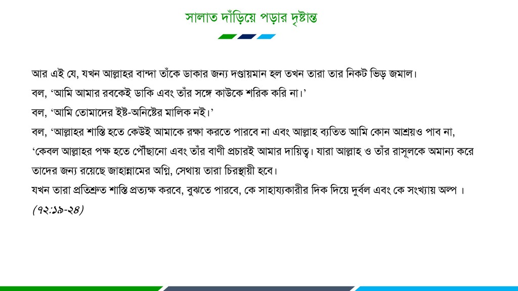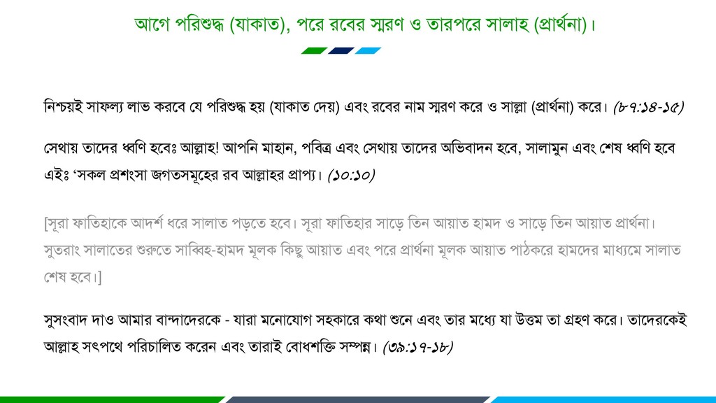 রনশ্চেই াপরয রাব কযরফ হম রযরৄদ্ধ ে (মাকাত হদে) এফং যরফয নাভ স্মযণ করয ও াল্লা (প্রাথযনা) করয। (৮৭:১৪-১৫) হথাে তারদয ধ্বরণ রফেঃ আল্লা! আরন ভাান, রফত্র এফং হথাে তারদয অরবফাদন রফ, ারাভুন এফং হল ধ্বরণ রফ এইেঃ ‘কর প্রংা জগতভূরয যফ আল্লায প্রায। (১০:১০) [ূযা পারতারক আদয ধরয ারাত ড়রত রফ। ূযা পারতায ারড় রতন আোত াভদ ও ারড় রতন আোত প্রাথযনা। সুতযাং ারারতয রৄরুরত ারি-াভদ ভূরক রকিু আোত এফং রয প্রাথযনা ভূরক আোত াঠকরয াভরদয ভাধযরভ ারাত হল রফ।] সুংফাদ দাও আভায ফান্দারদযরক - মাযা ভরনারমাগ কারয কথা রৄরন এফং তায ভরধয মা উত্তভ তা গ্রণ করয। তারদযরকই আল্লা ৎরথ রযচাররত করযন এফং তাযাই হফাধরি ম্পন্ন। (৩৯:১৭-১৮)