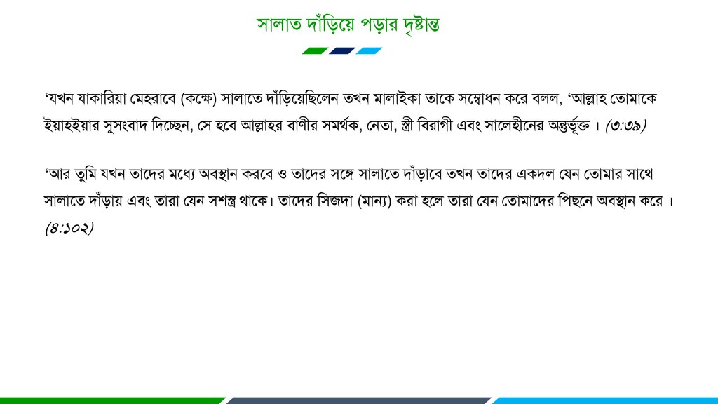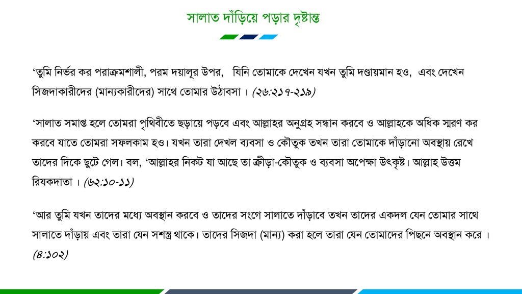 উয, রমরন হতাভারক হদরখন মখন তুরভ দণ্ডােভান ও, এফং হদরখন রজদাকাযীরদয (ভান্যকাযীরদয) ারথ হতাভায উঠাফা । (২৬:২১৭-২১৯) ‘ারাত ভাপ্ত রর হতাভযা ৃরথফীরত িড়ারে ড়রফ এফং আল্লায অনুগ্র ন্ধান কযরফ ও আল্লারক অরধক স্মযণ কয কযরফ মারত হতাভযা পরকাভ ও। মখন তাযা হদখর ফযফা ও হকৌতুক তখন তাযা হতাভারক দাাঁড়ারনা অফস্থাে হযরখ তারদয রদরক িুরে হগর। ফর, ‘আল্লায রনকে মা আরি তা ক্রীড়া-হকৌতুক ও ফযফা অরক্ষ্া উৎকৃষ্ট। আল্লা উত্তভ রযমকদাতা । (৬২:১০-১১) ‘আয তুরভ মখন তারদয ভরধয অফস্থান কযরফ ও তারদয ংরগ ারারত দাাঁড়ারফ তখন তারদয একদর হমন হতাভায ারথ ারারত দাাঁড়াে এফং তাযা হমন স্ত্র থারক। তারদয রজদা (ভান্য) কযা রর তাযা হমন হতাভারদয রিরন অফস্থান করয । (৪:১০২)