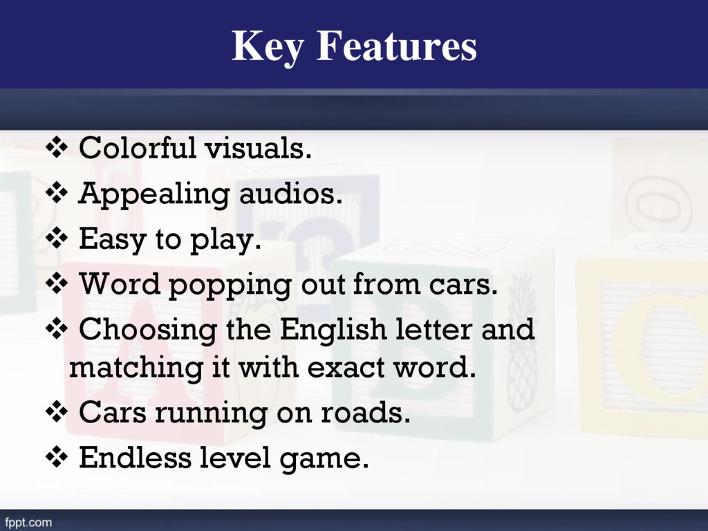 Word popping out from cars. Choosing the English letter and matching it with exact word. Cars running on roads. Endless level game. Key Features