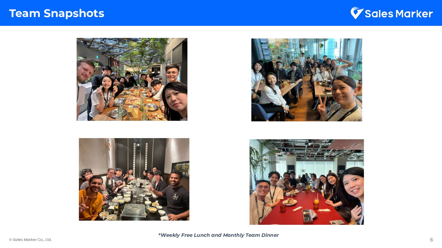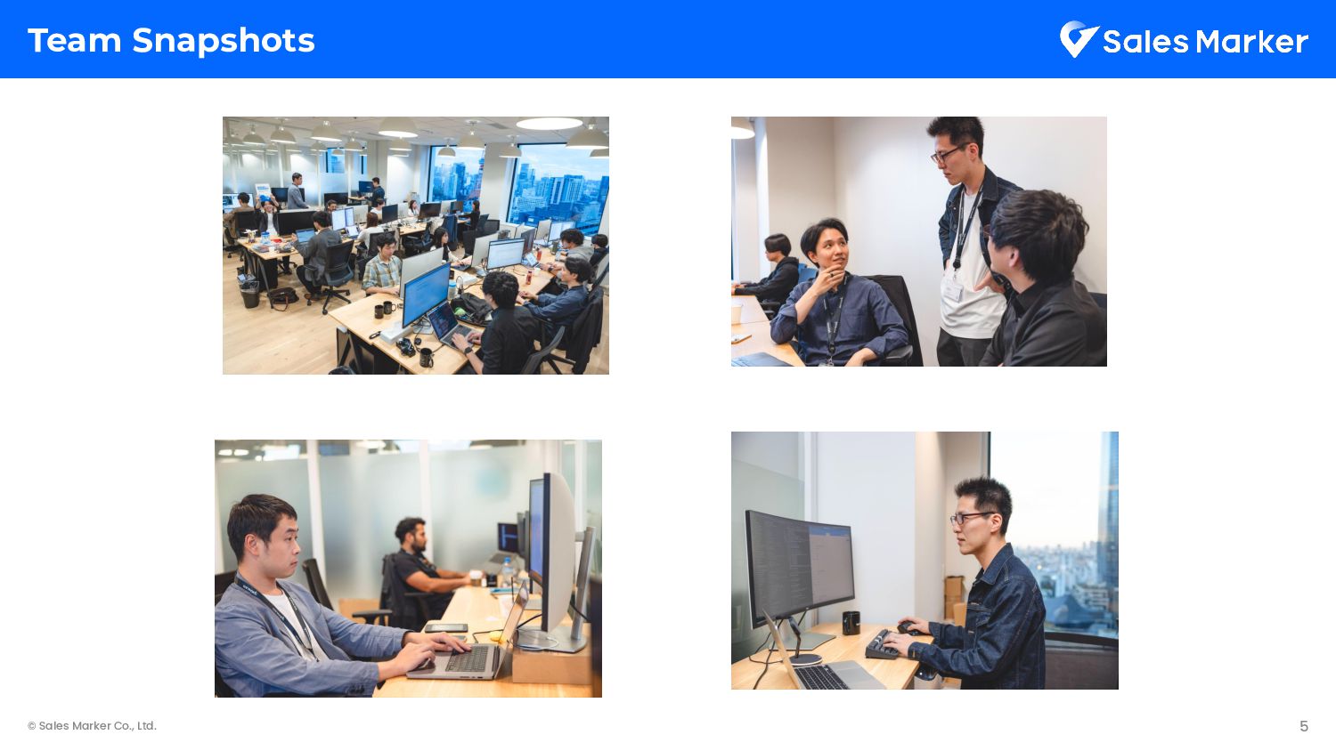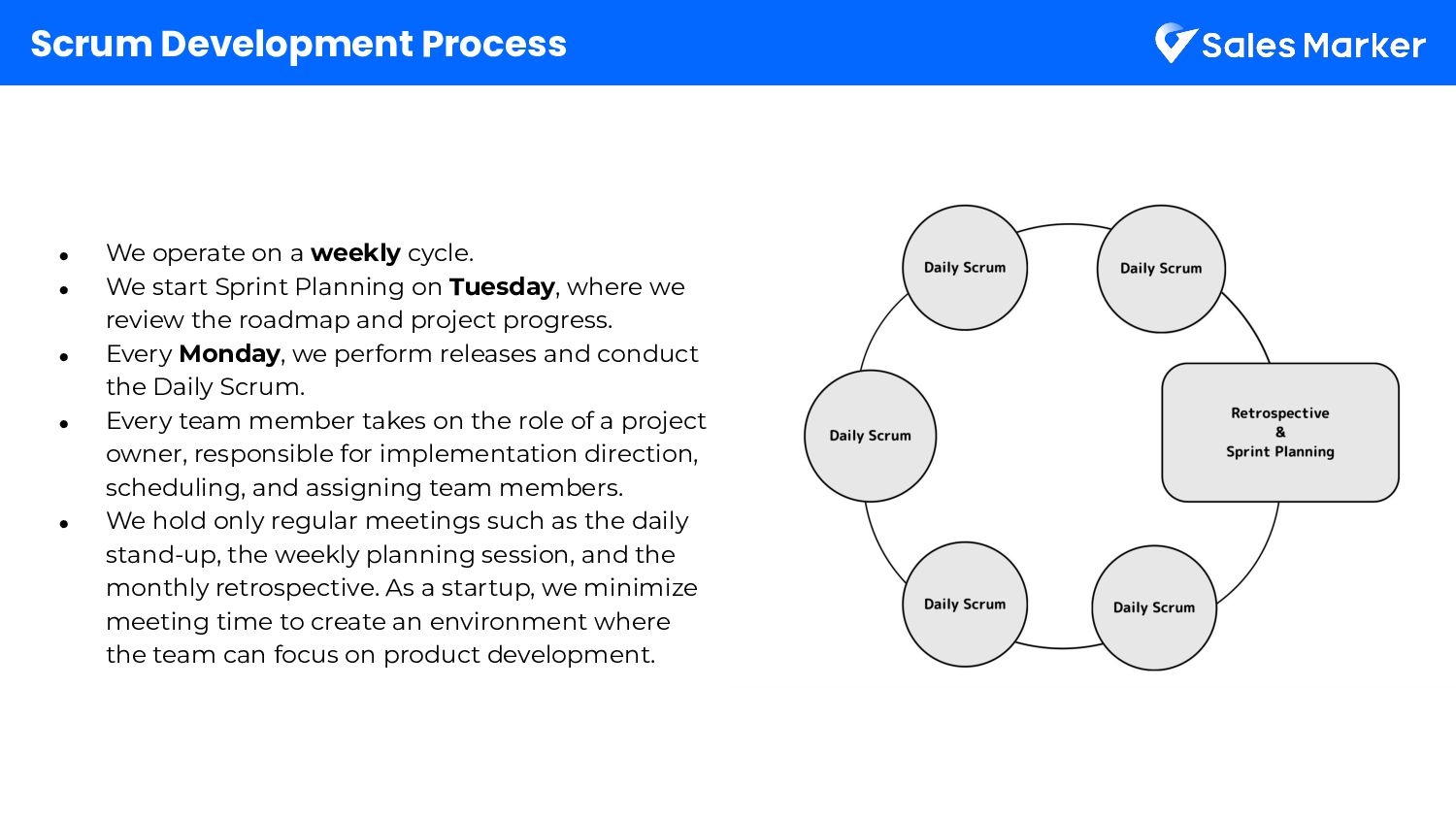 • We start Sprint Planning on Tuesday, where we review the roadmap and project progress. • Every Monday, we perform releases and conduct the Daily Scrum. • Every team member takes on the role of a project owner, responsible for implementation direction, scheduling, and assigning team members. • We hold only regular meetings such as the daily stand-up, the weekly planning session, and the monthly retrospective. As a startup, we minimize meeting time to create an environment where the team can focus on product development.