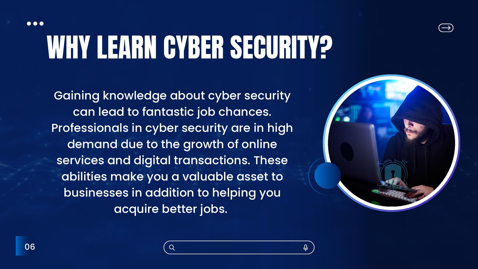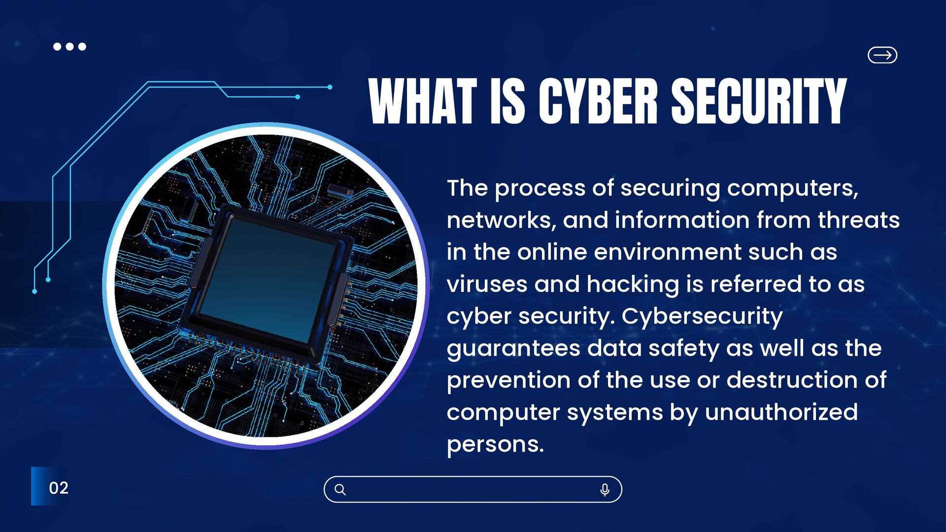 in the online environment such as viruses and hacking is referred to as cyber security. Cybersecurity guarantees data safety as well as the prevention of the use or destruction of computer systems by unauthorized persons. WHAT IS CYBER SECURITY 02
