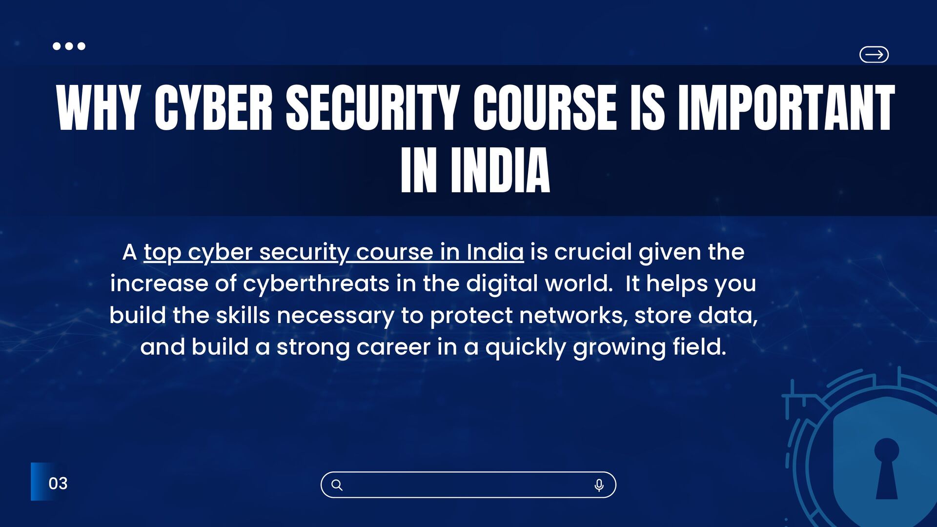 top cyber security course in India is crucial given the increase of cyberthreats in the digital world. It helps you build the skills necessary to protect networks, store data, and build a strong career in a quickly growing field.