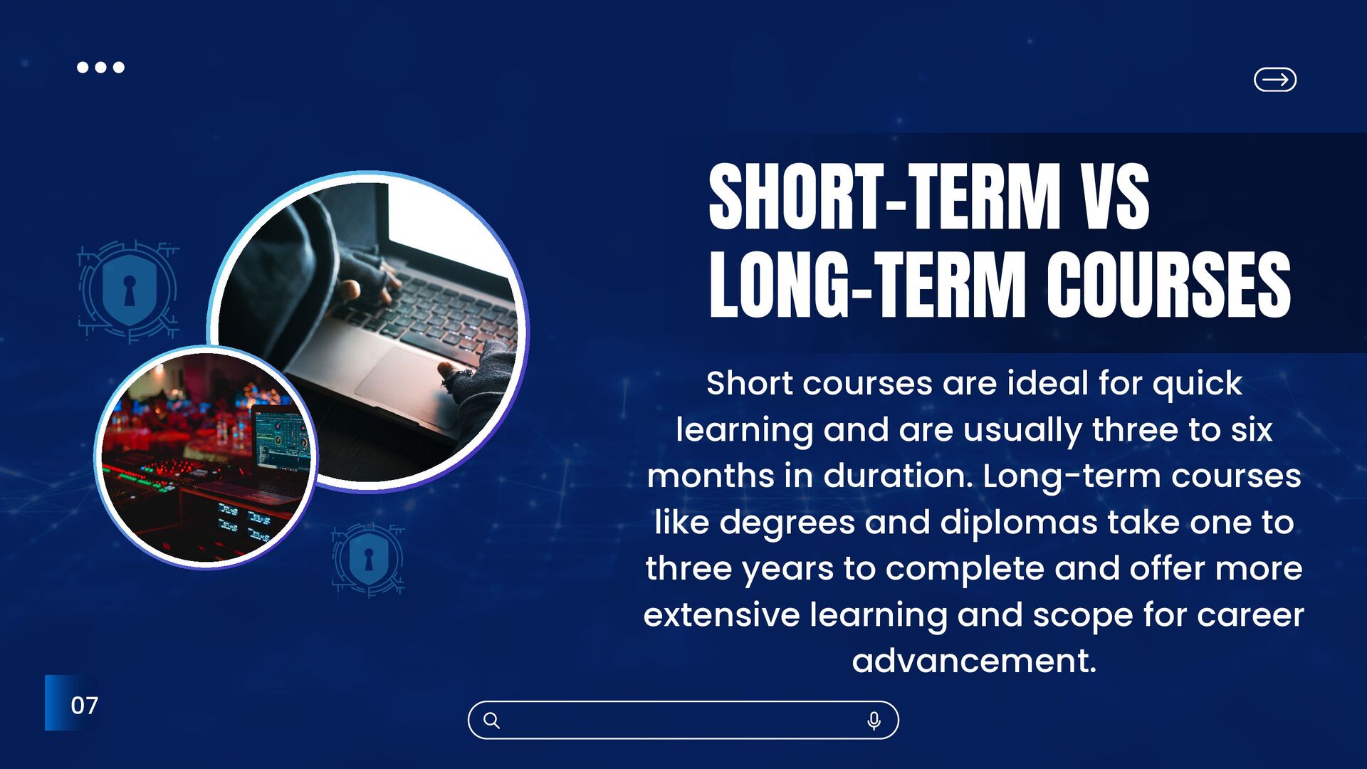 usually three to six months in duration. Long-term courses like degrees and diplomas take one to three years to complete and offer more extensive learning and scope for career advancement. SHORT-TERM VS LONG-TERM COURSES