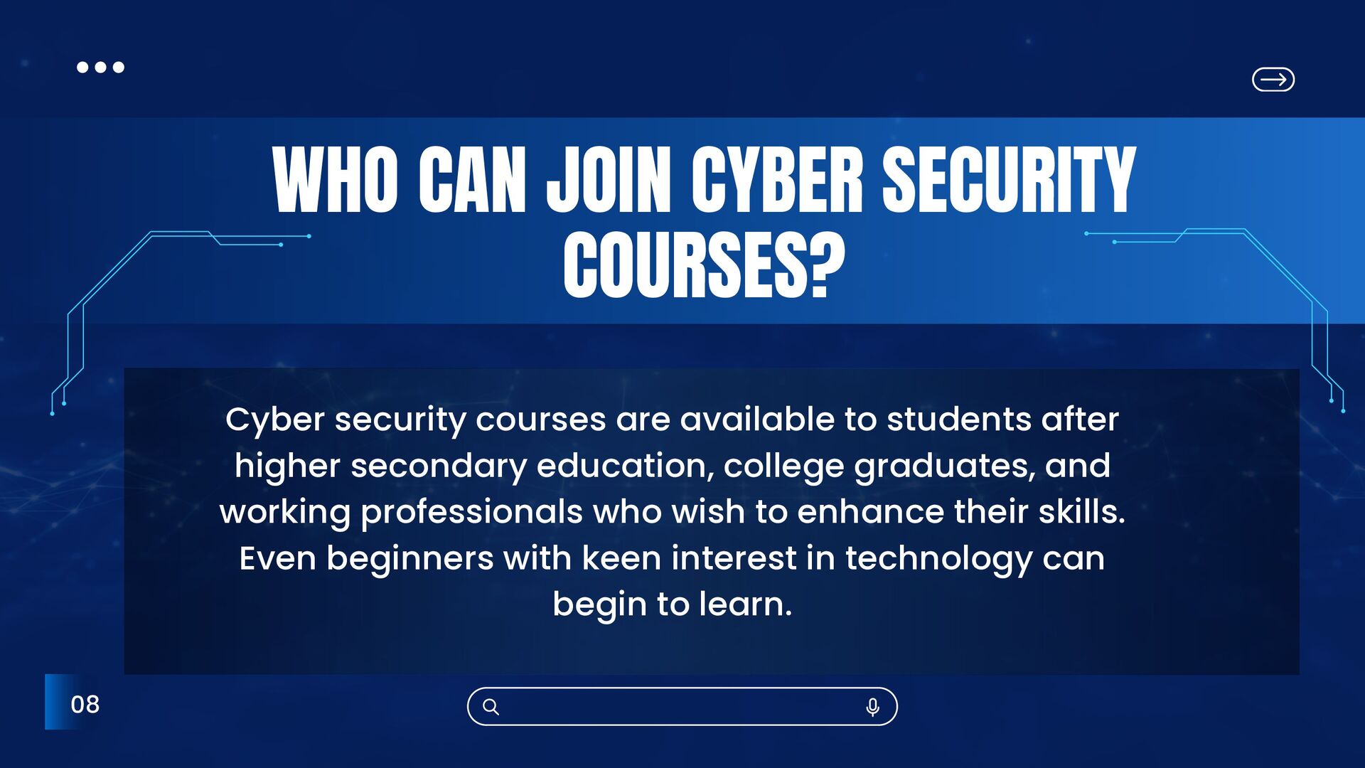 are available to students after higher secondary education, college graduates, and working professionals who wish to enhance their skills. Even beginners with keen interest in technology can begin to learn.