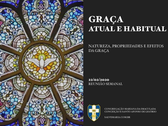 qualidade acidental permanente da alma, um hábito infundido pelo Espírito Santo, uma participação na Vida de Deus ▸ Por essa razão, nossos atos recebem força sobrenatural — não sou eu que vivo ▸ Pela Graça Habitual, se nos dá para dEle gozarmos ▸ Santidade, Beleza Sobrenatural, Amizade Divina, Adoção Filial 23 CONGREGAÇÃO MARIANA DA IMACULADA CONCEIÇÃO E SANTO AFONSO DE LIGÓRIO - MANAUS/AM • SALVEMARIA.COM.BR GRAÇA ATUAL E HABITUAL – NATUREZA, PROPRIEDADES E EFEITOS DA GRAÇA