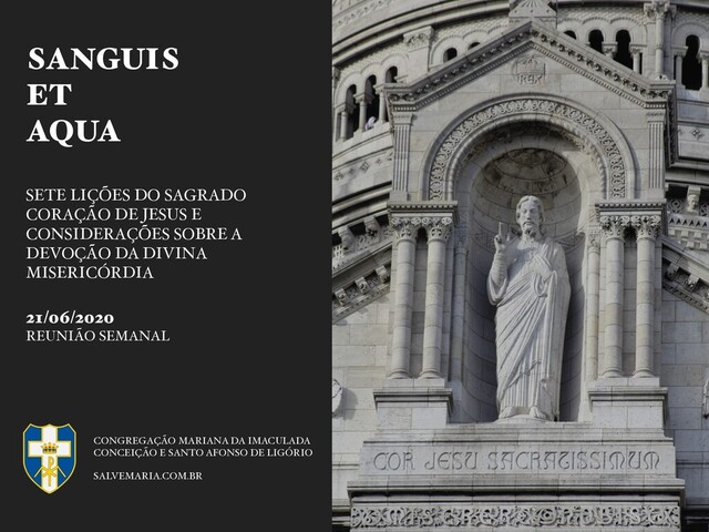 (Pv 23, 26) ▸ Maria guardava todas essas coisas em seu coração (Lc 2, 41ss) ▸ O homem tira o bem do bom tesouro que está em seu coração (Lc 6, 45) ▸ Honram-me com os lábios, mas seu coração está longe de mim (Mt 15, 8) ▸ Misericordia et Misera (Jo 8, 1-11) ▸ Aprendei de mim (Mt 11, 28) CONGREGAÇÃO MARIANA DA IMACULADA CONCEIÇÃO E SANTO AFONSO DE LIGÓRIO - MANAUS/AM • SALVEMARIA.COM.BR SANGUIS ET AQUA - LIÇÕES DO SAGRADO CORAÇÃO E A DIVINA MISERICÓRDIA (21/06/20)