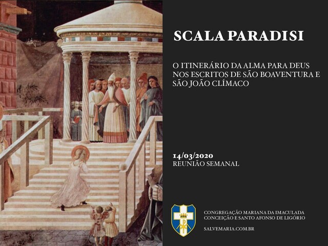 de 575 na Palestina ▸ Monge aos 16 anos, discípulo de Martírio. Aos 20 anos, eremita em uma gruta do monte Sinai, onde habitou por 40 anos — Vida contemplativa, litúrgica e apostólica ▸ Nomeado abade do Mosteiro do Sinai aos 60 anos. ▸ Morto em 650. Doutor e Luz do Oriente e do Ocidente 13 CONGREGAÇÃO MARIANA DA IMACULADA CONCEIÇÃO E SANTO AFONSO DE LIGÓRIO - MANAUS/AM • SALVEMARIA.COM.BR SCALA PARADISI - O ITINERÁRIO DA ALMA PARA DEUS