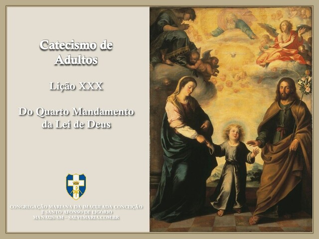 com Jesus e lhe disseram: 2.“Por que transgridem teus discípulos a tradição dos antigos? Nem mesmo lavam as mãos antes de comer”. 3.Jesus respondeu-lhes: “E vós, por que violais os preceitos de Deus, por causa de vossa tradição? 4.Deus disse: Honra teu pai e tua mãe; aquele que amaldiçoar seu pai ou sua mãe será castigado de morte (Ex 20,12; 21,17). 5.Mas vós dizeis: Aquele que disser a seu pai ou a sua mãe: ‘aquilo com que eu vos poderia assistir já ofereci a Deus’,* 6.esse já não é obrigado a socorrer de outro modo a seus pais. Assim, por causa de vossa tradição, anulais a Palavra de Deus. 7.Hipócritas! É bem de vós que fala o profeta Isaías: 8.Este povo somente me honra com os lábios; seu coração, porém, está longe de mim. 9.Vão é o culto que me prestam, porque ensinam preceitos que só vêm dos homens!”. (Is 29,13).“ Mt XV 1-9 CONGREGAÇÃO MARIANA DA IMACULADA CONCEIÇÃO E S. AFONSO DE LIGÓRIO – MANAUS/AM salvemaria.com.br Catecismo de Adultos Lição XXX: Do Quarto Mandamento da Lei de Deus