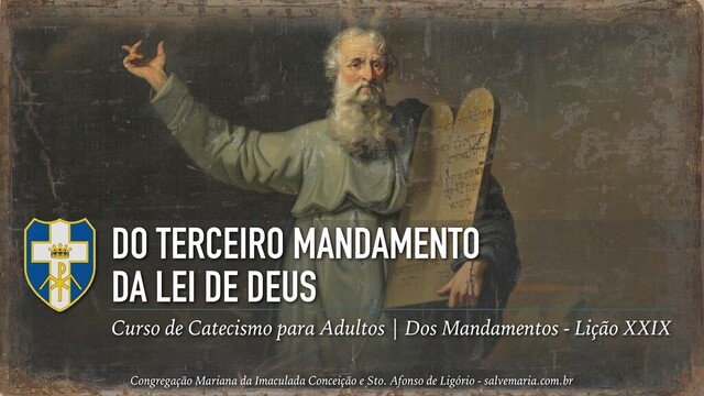 sábado. Trabalharás durante seis dias e farás (neles) todas as tuas obras. O sétimo dia, porém, é o sábado (dia de repouso) consagrado ao Senhor teu Deus; não farás nele obra alguma, nem tu, nem teu filho, nem tua filha, nem o teu servo, nem a tua serva, nem o teu gado, nem o peregrino que está dentro das tuas portas. Porque o Senhor fez em seis dias o céu e a terra, e o mar, e tudo o que neles há, e descansou ao sétimo dia; por isso o Senhor abençoou o dia de sábado e o santificou. Congregação Mariana da Imaculada Conceição e Sto. Afonso de Ligório - salvemaria.com.br Curso de Catecismo para Adultos | Dos Mandamentos - Lição XXIX - Do Terceiro Mandamento