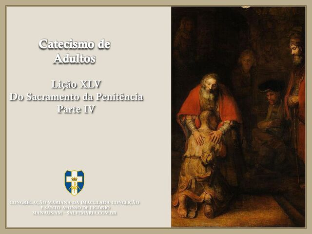 – MANAUS/AM salvemaria.com.br Catecismo de Adultos Lição XLIV: Do Sacramento da Penitência Da Dor ou Arrependimento Uma mulher pecadora da cidade, quando soube que estava à mesa em casa do fariseu, trouxe um vaso de alabastro cheio de perfume; e, estando a seus pés, por detrás dele, começou a chorar. Pouco depois suas lágrimas banhavam os pés do Senhor e ela os enxugava com os cabelos, beijava- os e os ungia com o perfume. E disse a ela: Perdoados te são os pecados.