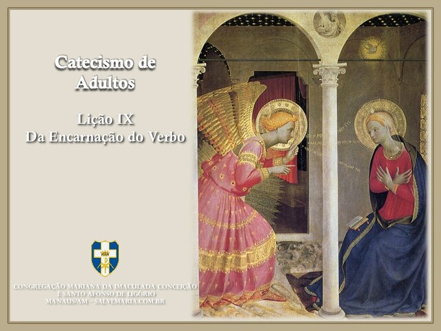 Deus erat Verbum. Hoc erat in princípio apud Deum. Omnia per ipsum facta sunt: et sine ipso factum est nihil, quod factum est: in ipso vita erat, et vita erat lux hóminum: et lux in ténebris lucet, et ténebræ eam non comprehendérunt. [...] Erat lux vera, quæ illúminat omnem hóminem veniéntem in hunc mundum. In mundo erat, et mundus per ipsum factus est, et mundus eum non cognóvit. In própria venit, et sui eum non recepérunt. Quotquot autem recepérunt eum, dedit eis potestátem fílios Dei fíeri, his, qui credunt in nómine eius: qui non ex sanguínibus, neque ex voluntáte carnis, neque ex voluntáte viri, sed ex Deo nati sunt. Et Verbum caro factum est, et habitávit in nobis: et vídimus glóriam eius, glóriam quasi Unigéniti a Patre, plenum grátiæ et veritátis. CONGREGAÇÃO MARIANA DA IMACULADA CONCEIÇÃO E S. AFONSO DE LIGÓRIO – MANAUS/AM salvemaria.com.br Catecismo de Adultos Lição IX: Da Encarnação do Verbo No princípio era o Verbo, e o Verbo estava com Deus, e o Verbo era Deus. Ele estava no princípio com Deus. Todas as coisas foram feitas por Ele, e sem Ele nada do que foi feito se fez. Nele estava a vida, e a vida era a luz dos homens. E a luz resplandece nas trevas, e as trevas não a compreenderam. [...] Ali estava a Luz verdadeira, que ilumina a todo o homem que vem a este mundo. Estava no mundo, e o mundo foi feito por Ele, e o mundo não O conheceu. Veio para o que era seu, e os seus não O receberam. Mas, a todos quantos O receberam, deu-lhes o poder de se tornarem filhos de Deus, aos que crêem no seu Nome; Os quais não nasceram do sangue, nem do desejo da carne, nem da vontade do homem, mas nasceram de Deus. E o Verbo se fez carne e habitou entre nós, e vimos a sua glória, glória própria do Filho Unigênito do Pai, cheio de graça e de verdade.