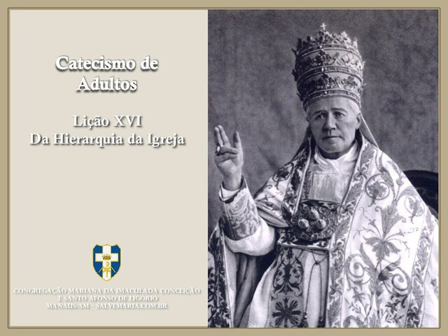 salve! A vós bradamos os degregados filhos de Eva; a vós suspiramos gemendo e chorando neste vale de lágrimas. Eia, pois, advogada nossa, esses vossos olhos misericordiosos a nós volvei. E, depois deste desterro, mostrai-nos Jesus, bendito fruto do vosso ventre. Ó clemente, ó piedosa, ó doce sempre Virgem Maria. Rogai por nós Santa Mãe de Deus, para que sejamos dignos das promessas de Cristo. CONGREGAÇÃO MARIANA DA IMACULADA CONCEIÇÃO E S. AFONSO DE LIGÓRIO – MANAUS/AM salvemaria.com.br Catecismo de Adultos Lição XVI: Da Hierarquia da Igreja Salve Rainha