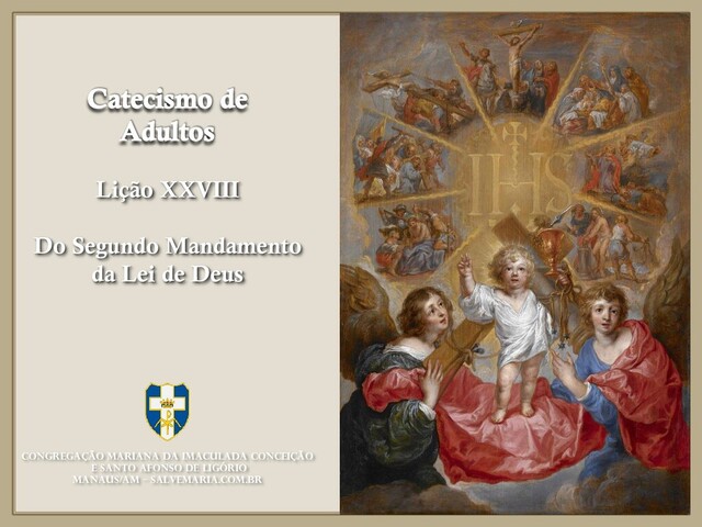 sabendo do ocorrido. Pedro perguntou-lhe: Dize-me, mulher. Foi por tanto que vendestes o vosso campo? Respondeu ela: Sim, por esse preço. Replicou Pedro: Por que combinastes para pôr à prova o Espírito do Senhor? Estão ali à porta os pés daqueles que sepultaram teu marido. Hão de levar-te também a ti. Imediatamente caiu aos seus pés e expirou. Entrando aqueles moços, acharam-na morta. Levaram-na para fora e a enterraram junto do seu marido. Sobreveio grande pavor a toda a comunidade e a todos os que ouviram falar desse acontecimento.” Actus Apostolorum V, 1-11. CONGREGAÇÃO MARIANA DA IMACULADA CONCEIÇÃO E S. AFONSO DE LIGÓRIO – MANAUS/AM salvemaria.com.br Catecismo de Adultos Lição XXVIII: Do Segundo Mandamento da Lei de Deus