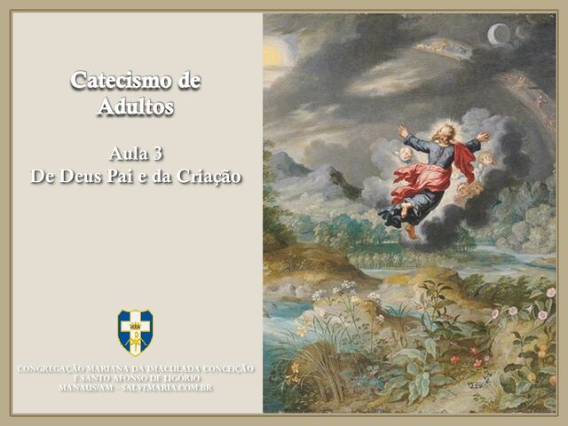 demonstra e a fé confirma. ❖ As cinco vias de S. Tomás ❖ Movimento ❖ Nossos sentidos atestam, com toda certeza, que neste mundo algumas coisas se movem. Ora, tudo o que é movido é movido por outro. Nada se move que não esteja em potência em relação ao termo de seu movimento; ao contrário o que se move o faz enquanto se encontra em ato” (S. Th. I, q.2, a. 3) ❖ Assim, se o que move é também movido, o é necessariamente por outro, e este por outro ainda. Ora, não se pode continuar até o infinito, pois neste caso não haveria um primeiro motor, por conseguinte, tampouco outros motores, pois os motores segundos só se movem pela moção de outro motor. Logo, é então necessário chegar a um primeiro motor, não movido por nenhum outro, e este, todos entendem: é Deus” (S. Th. I, q.2, a. 3). CONGREGAÇÃO MARIANA DA IMACULADA CONCEIÇÃO E S. AFONSO DE LIGÓRIO – MANAUS/AM salvemaria.com.br Catecismo de Adultos Aula 3: De Deus Pai e da Criação Como sabemos que há Deus?