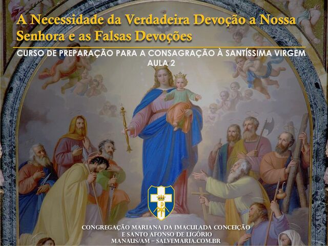 – MANAUS/AM salvemaria.com.br Curso de Consagração – Necessidade da Verdadeira Devoção e as Falsas Devoções Deus quis servir-se de Maria na Santificação das Almas “Quando aparecer Cristo, que é a vossa vida, então também vós aparecereis com ele na glória (Cl. 3, 4). De fato Cristo aniquilou-se a Si mesmo para se fazer para nós justiça, santificação e redenção. Esta fonte chegou até nós, suas águas deram a vida eterna àqueles que dela aproximaram-se. Esta fonte, porém, chegou-nos através do Aqueduto, que em abundância prorrompeu graças de sua plenitude, em uns mais, em outros menos. Este Aqueduto não deu a plenitude totalmente, mas deu da plenitude a todos” 2º Princípio