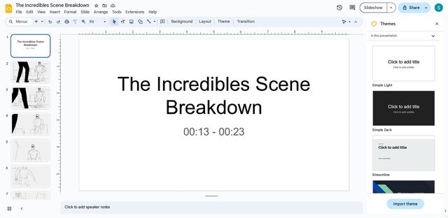 Arrange Tools Extensions Help Menus Fit Background Layout Theme Transition 1 The Incredibles Scene Breakdown 00:13 - 00:23 2 3 4 5 6 7 2 1 1 2 3 4 5 6 7 8 9 1 1 2 3 4 5 The Incredibles Scene Breakdown 00:13 - 00:23 Click to add speaker notes In this presentation Simple Light Simple Dark Streamline Import theme The Incredibles Scene Breakdown Themes Slideshow Share
