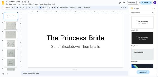 Tools Extensions Help Menus Fit Background Layout Theme Transition 1 The Princess Bride Script Breakdown Thumbnails 4 5 7 6 2 3 2 1 1 2 3 4 5 6 7 8 9 1 1 2 3 4 5 The Princess Bride Script Breakdown Thumbnails Click to add speaker notes In this presentation Simple Light Simple Dark Streamline Import theme The Princess Bride Themes Slideshow Share