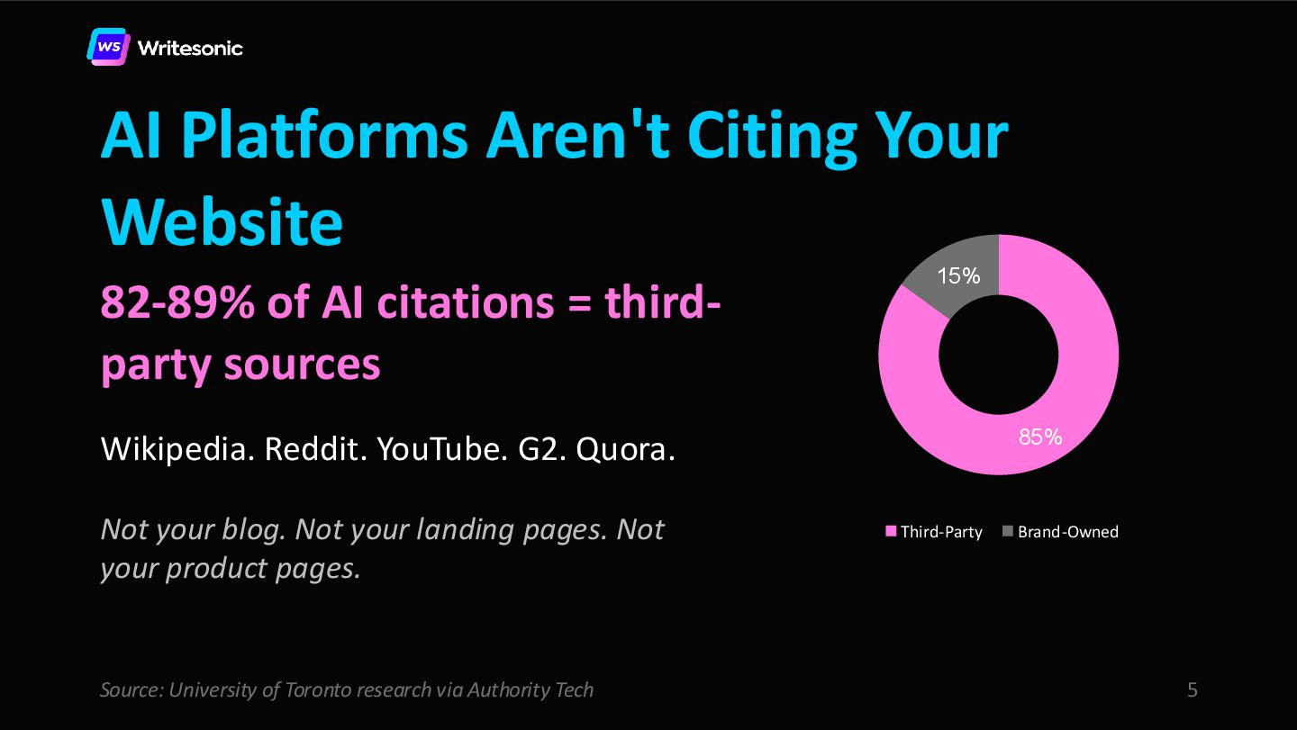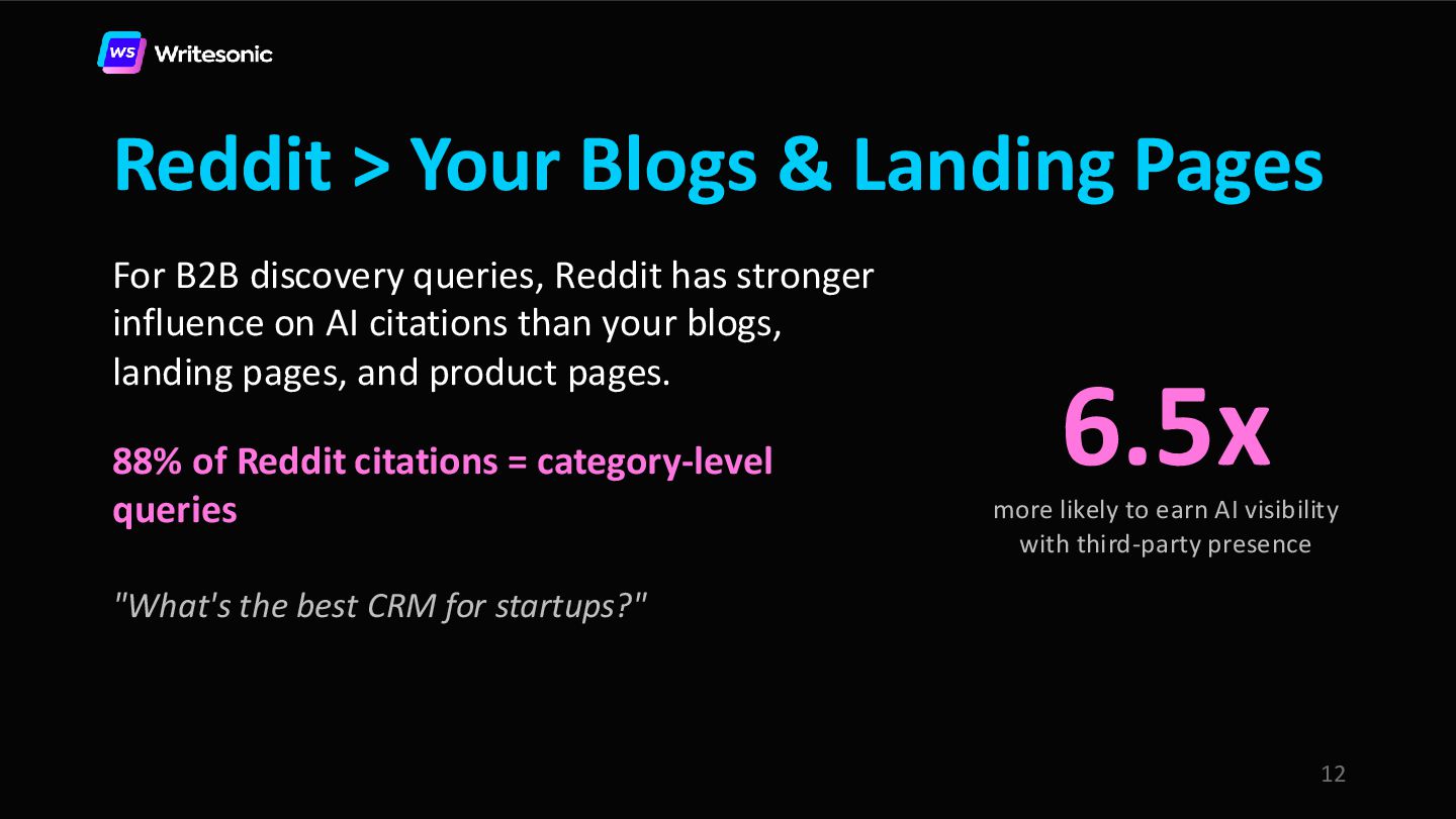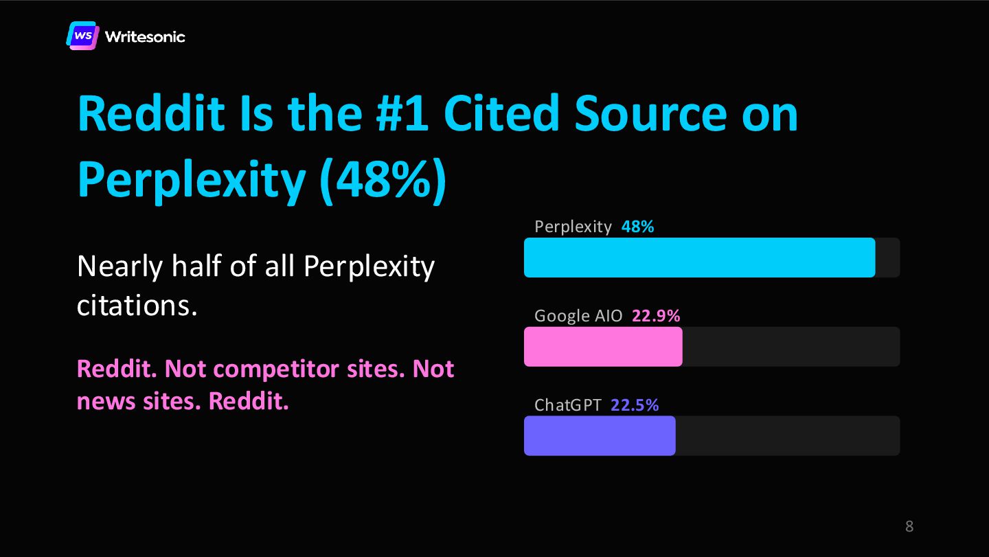 Reddit is the #1 cited source on Perplexity and a top citation source for ChatGPT and Google AI Overviews. Your website is your resume. Reddit is the reference check. And right now, AI is 6.5x more likely to cite a Reddit post than your own product page.